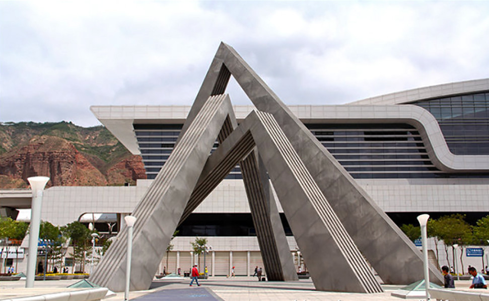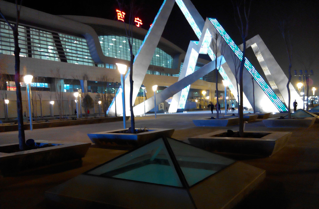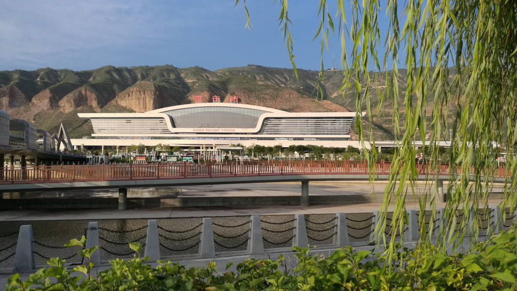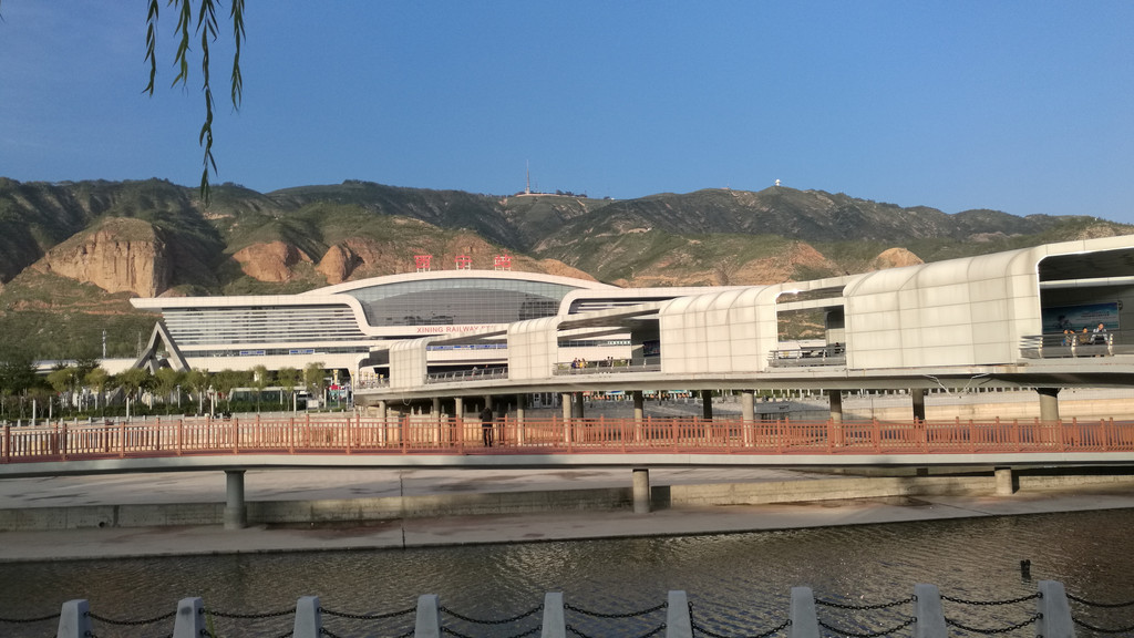 站前广场面积很大,一直延伸到湟水河畔。背后是青山,彰显青海地区壮丽雄阔的地方特色。广场上的大型雕塑三江交汇,象征长江、黄河、澜沧江-湄公河这三条大河都发源于青海。