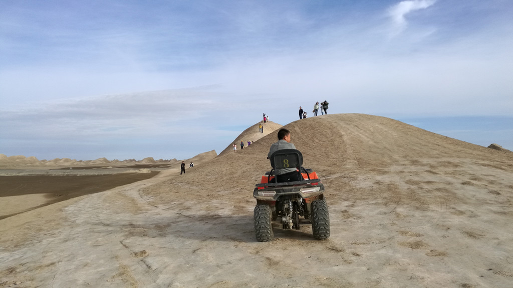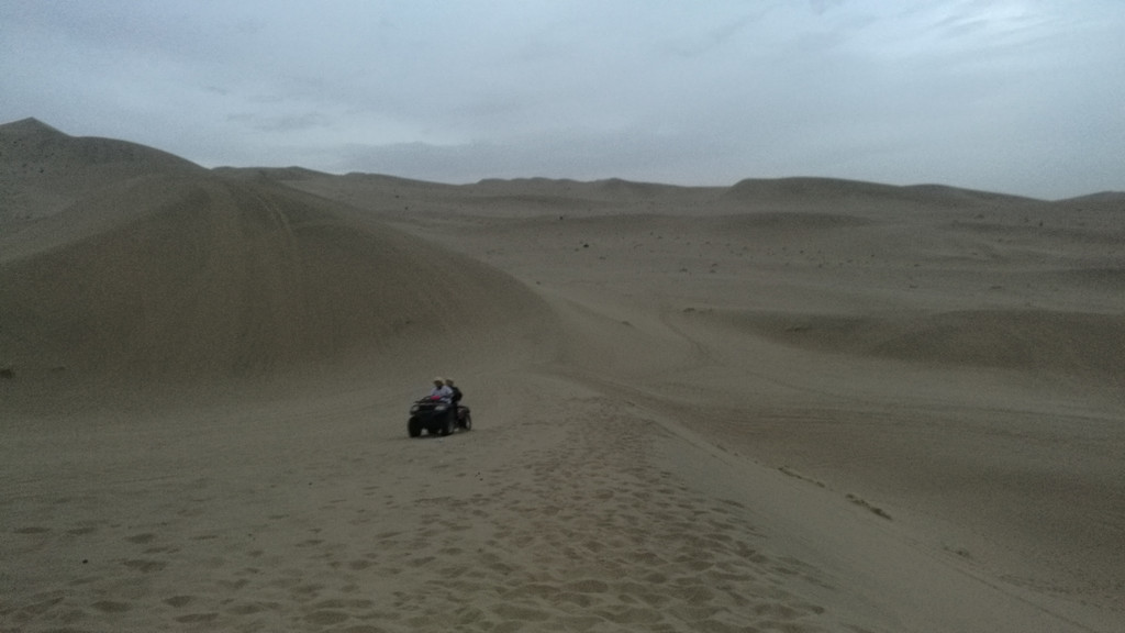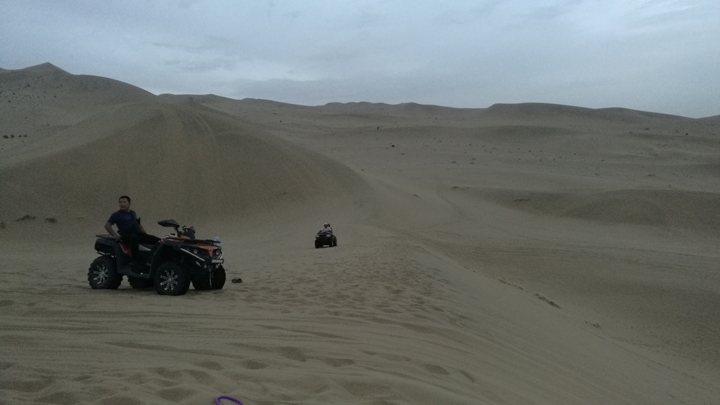 沙地摩托看上去有点可怕,沙丘那么高,角度那么陡,其实真正坐上去没什么,因为是四轮摩托,再说沙子的摩擦系数高,没事的。今天天色很晚了,我们两人一组乘坐摩托,也就1分多钟吧,体验了一把。