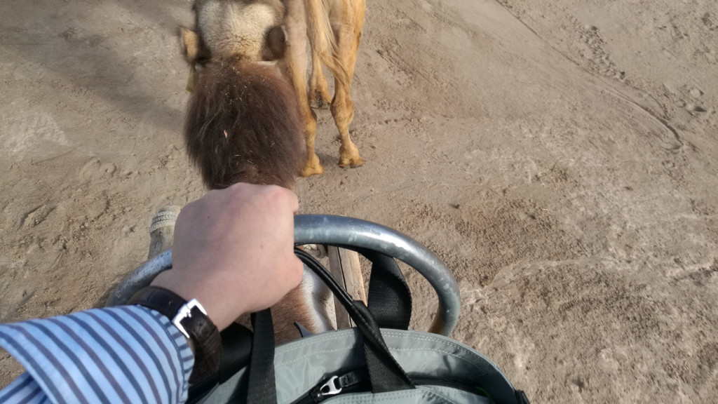整个骑行过程约一个小时,没骑过的可以体验一下。刚开始跨上驼背和最后下来的感觉很特别,现在还记得,在主人吆喝下,骆驼前腿后腿跪下时那种不情愿的样子。