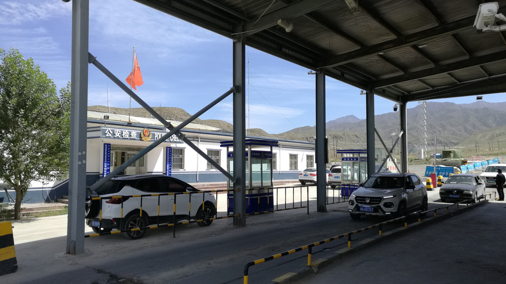 进入甘肃境内,经过一个检查站,正式名称是甘肃省酒泉市阿克塞哈萨克族自治县公安局交通警察大队长草沟中队。每个人下车拿着身份证验证,通过后放行。