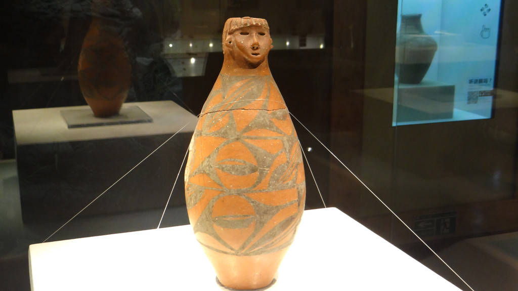人头形器口彩陶瓶(新石器时代仰韶文化),镇馆之宝之一。