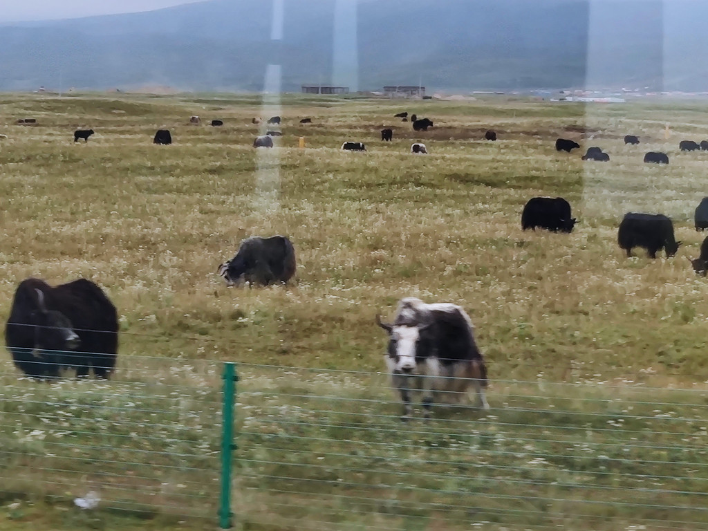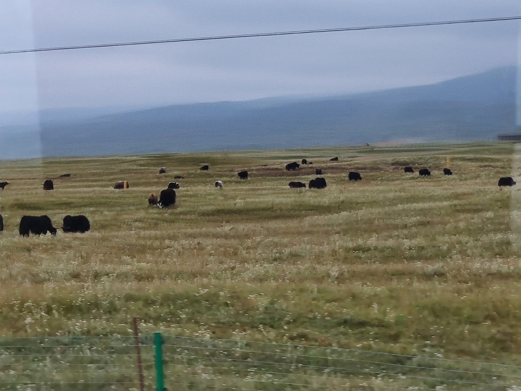 在当金山上,牦牛随处可见,三五成群,或者更多,安静地在戈壁上啃食青草。对于往来穿梭的车辆,他们应该是司空见惯,任谁经过都不在意,偶尔,他们会穿过公路到另一边,这时候,就该轮到我们人类避让了,没办法,是我们无端闯入了它们的地盘。
