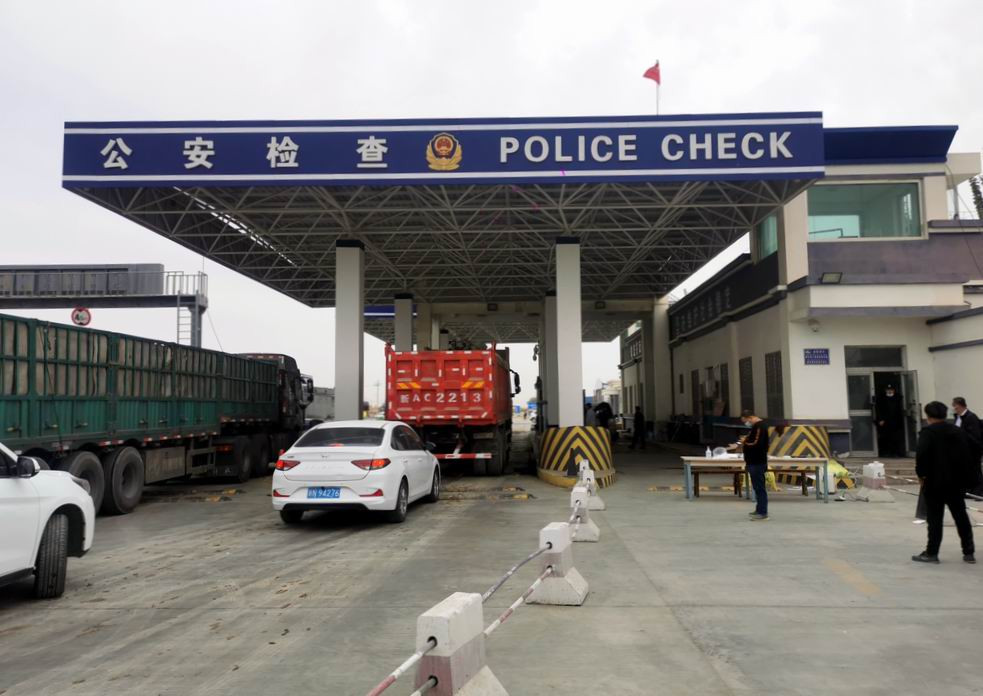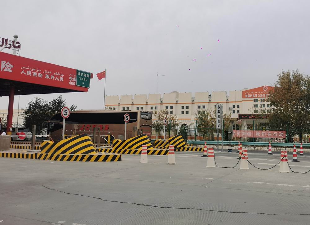 好在有工作人员过来通知,七座以下的小车可以先行。图为阿拉尔收费站。