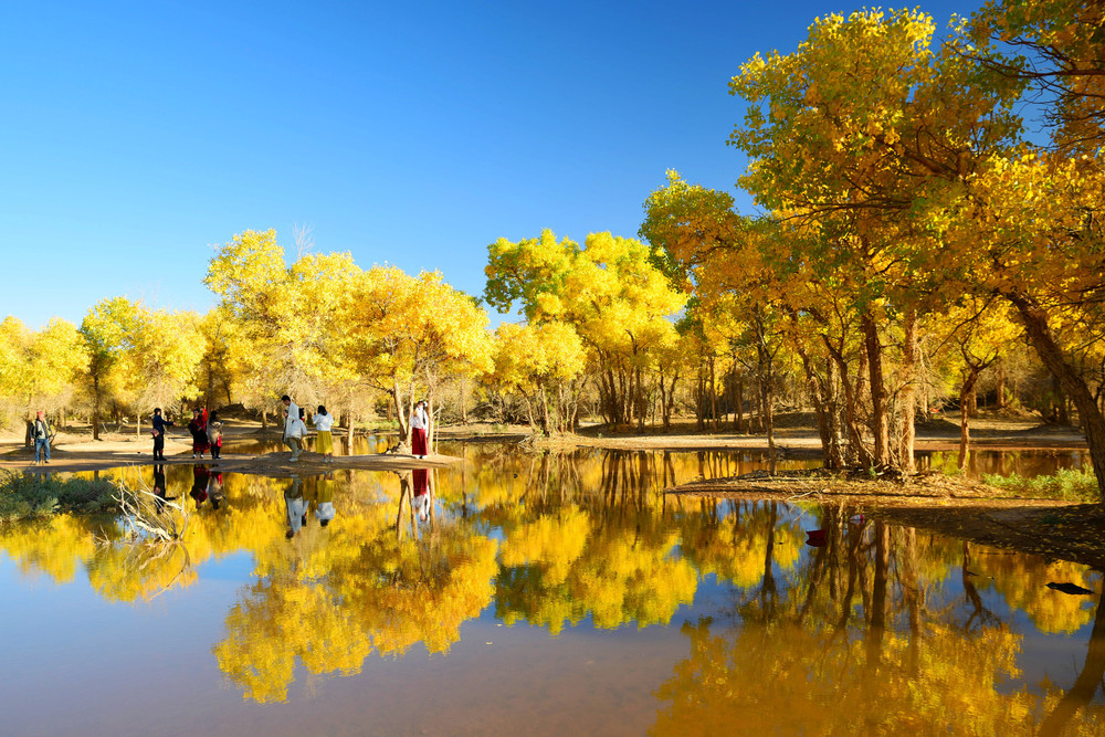 额济纳自治旗位于内蒙古自治区阿拉善盟额济纳旗,地处巴丹吉林沙漠。额济纳河两岸,分布着中国最为壮观的胡杨林。每年9、10月,当第一场秋霜,大片的胡杨树叶由绿变黄,一眼望去,阳光下金色的树叶衬着湛蓝的天空于风中婆娑起舞,那强烈的反差,鲜明的影调,亮丽的色彩,足以令任何语言文字显得苍白无力。