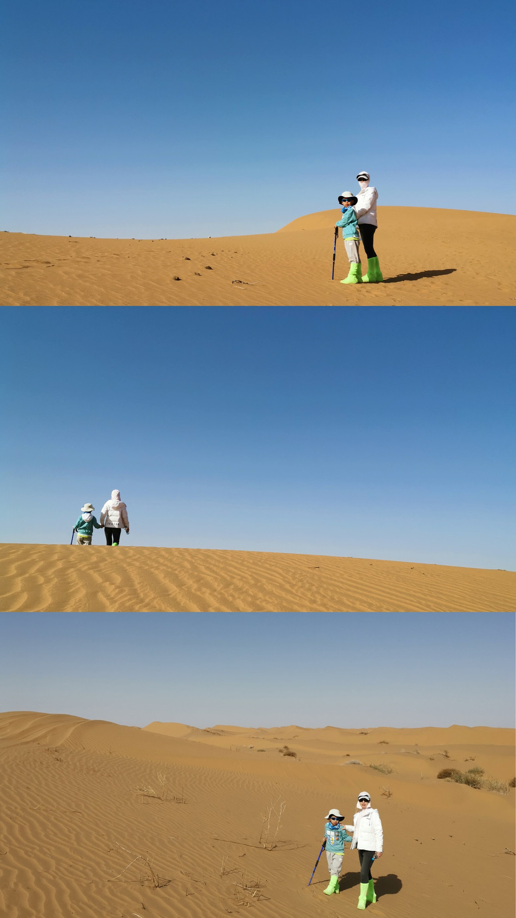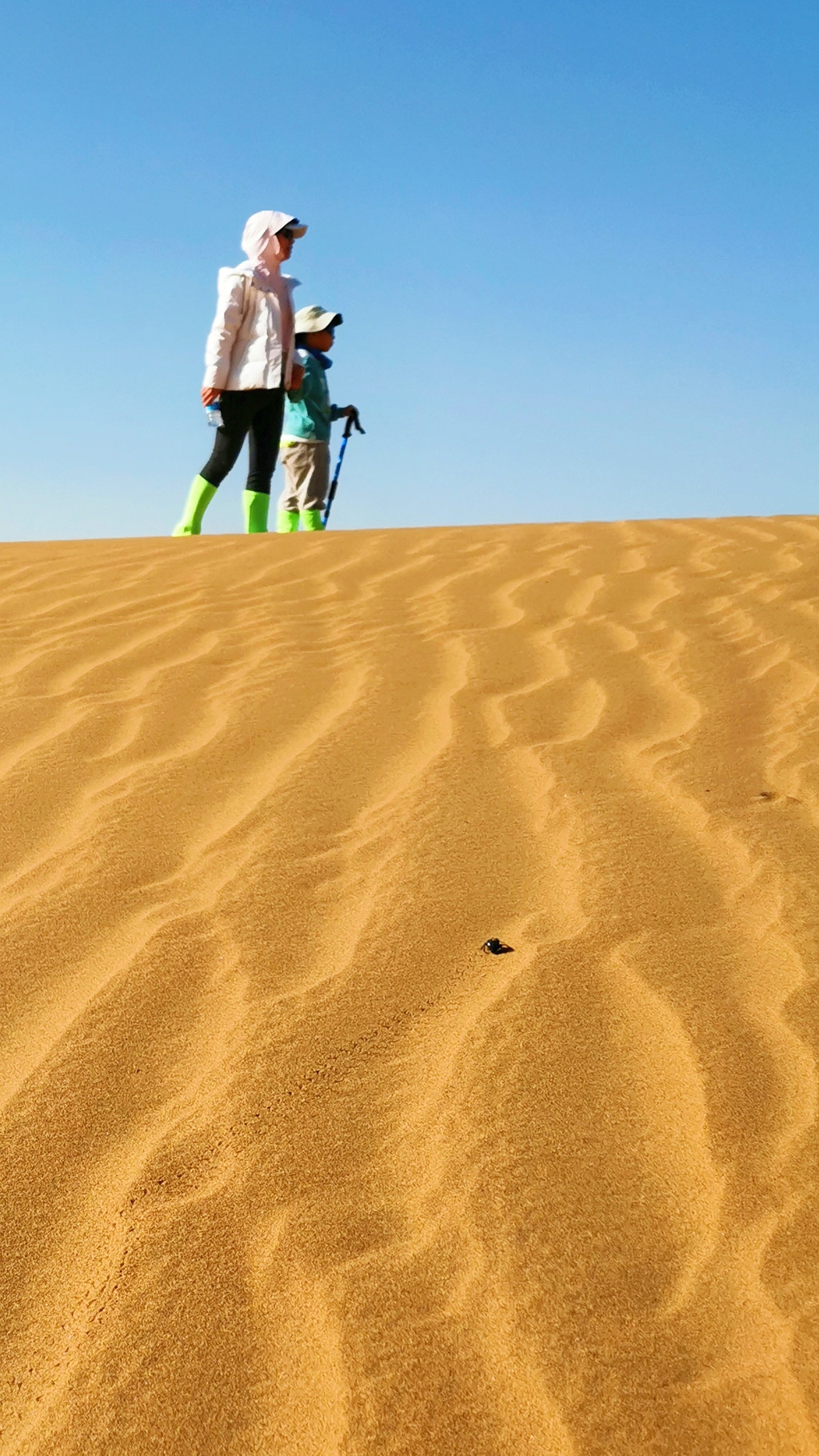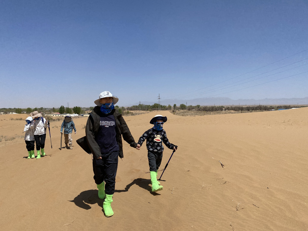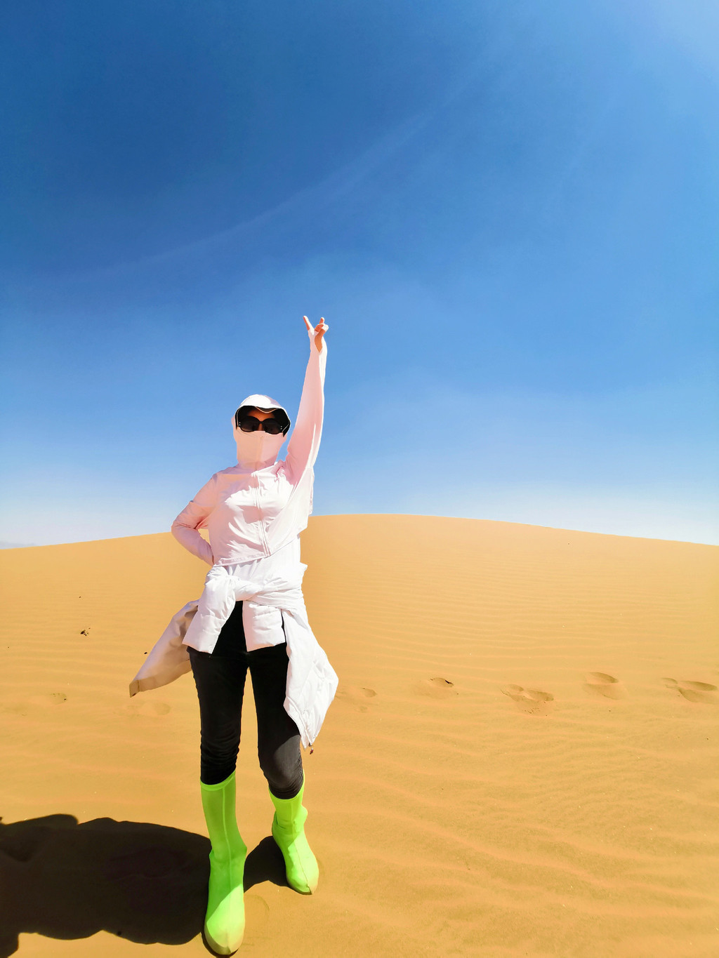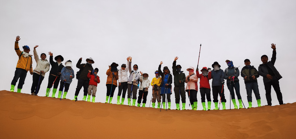 第一天午饭过后整装待发,为了防风遮日,每个人都用帽子、太阳镜、口罩、围巾里外三层把脑袋脖子捂得严严实实,脚上套上长筒鞋套,手持登山杖,伴随着欢呼和惊奇走进了沙漠。