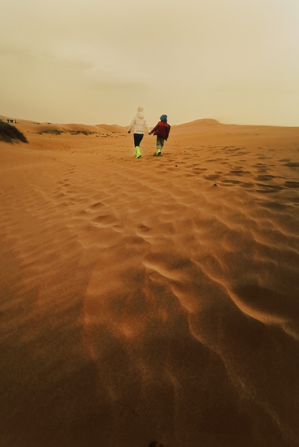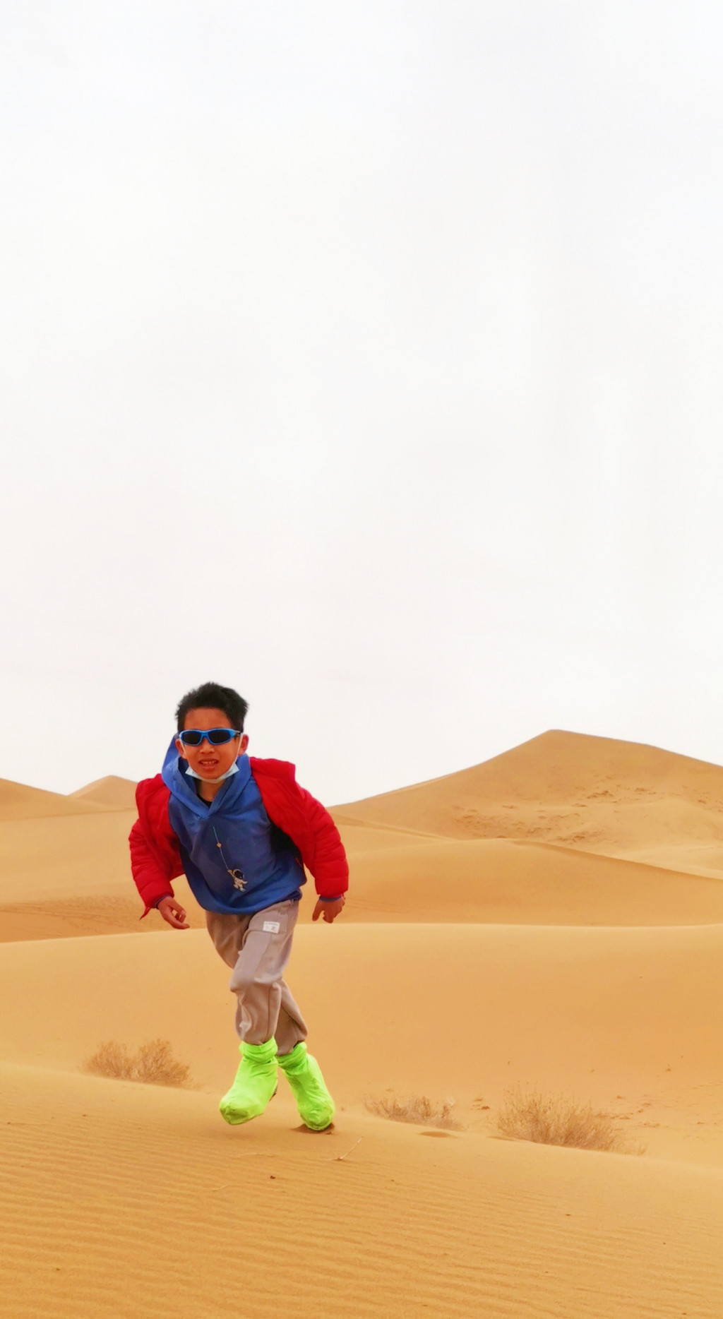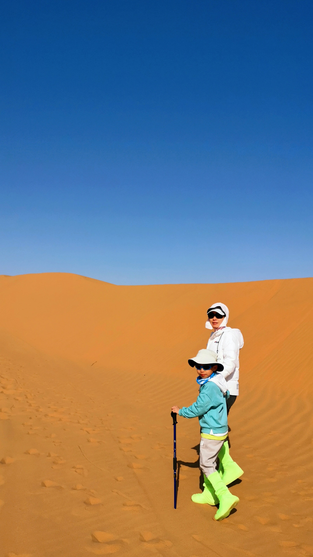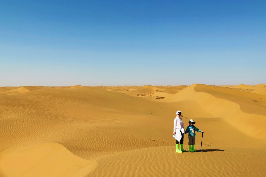 第一天午饭过后整装待发,为了防风遮日,每个人都用帽子、太阳镜、口罩、围巾里外三层把脑袋脖子捂得严严实实,脚上套上长筒鞋套,手持登山杖,伴随着欢呼和惊奇走进了沙漠。