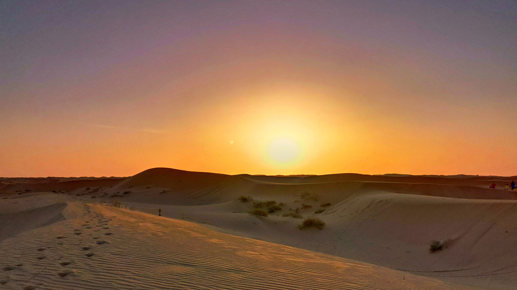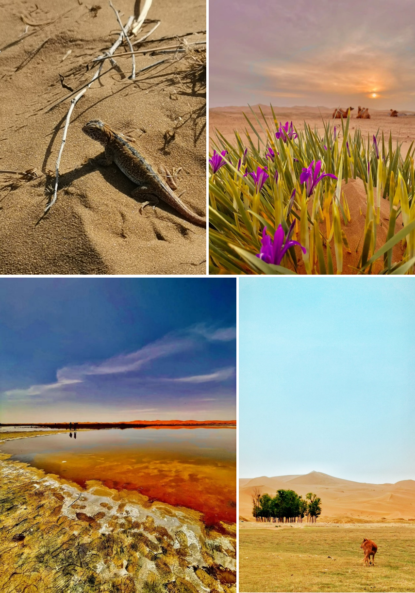 四月底是沙漠中一年中最好的时节,气候正好,风沙不燥。在走到腿上像灌铅一样沉重时,从脚边“嗖”一下穿过的小蜥蜴会让你打个冷战,然后又清醒起来跟上前行的队伍。当你对一片黄色的绵延起伏的沙丘视觉疲劳时,远远的一抹绿让你肃然起敬,这里还可以有如此扎眼的绿。当你慢慢走近,绿植丛中竟还冒出几朵紫色的马兰花,在这里,她们被映衬地如此优雅和高贵。当我们又途经一片湖时发现,光和影在大漠中还能折射出五彩斑斓的图景,我不懂艺术,但这种色调和饱和度让我莫名其妙地想到了梵高,这是大自然馈赠的印象派画作!所以,沙漠中也能生意盎然!