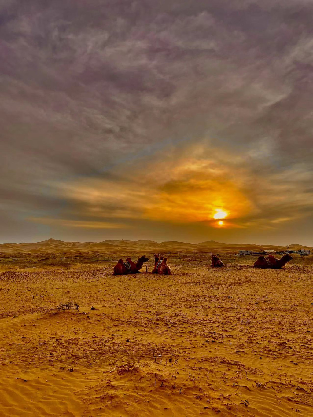 要在太阳落山前赶到营地,于是我们稍作休息后加速前行。沙漠的太阳落下地很慢,在这个季节一般到晚上7、8点天边还有鸽灰色的亮光,大概是为了给沙漠中穿行的人少些恐惧,多指引一会儿方向。大漠是荒芜贫瘠的,但也透着些感动。由于有向导带队,我们这些游客是没有对黑暗的畏惧的,虽快速前行,但也贪恋落日下沙漠的妩媚。日落时,沙漠被染红了,仿佛披上了一层橘红色的薄纱。这里有长河落日的壮阔,却没有大漠孤烟的寂寞。看着落日下安详的骆驼,对于沙漠的生命来说,他们在此生老病死是一件如此自然的事情,沙漠之于骆驼是和谐的存在,并不像沙漠之于人,是死寂、是荒凉、是挣扎!