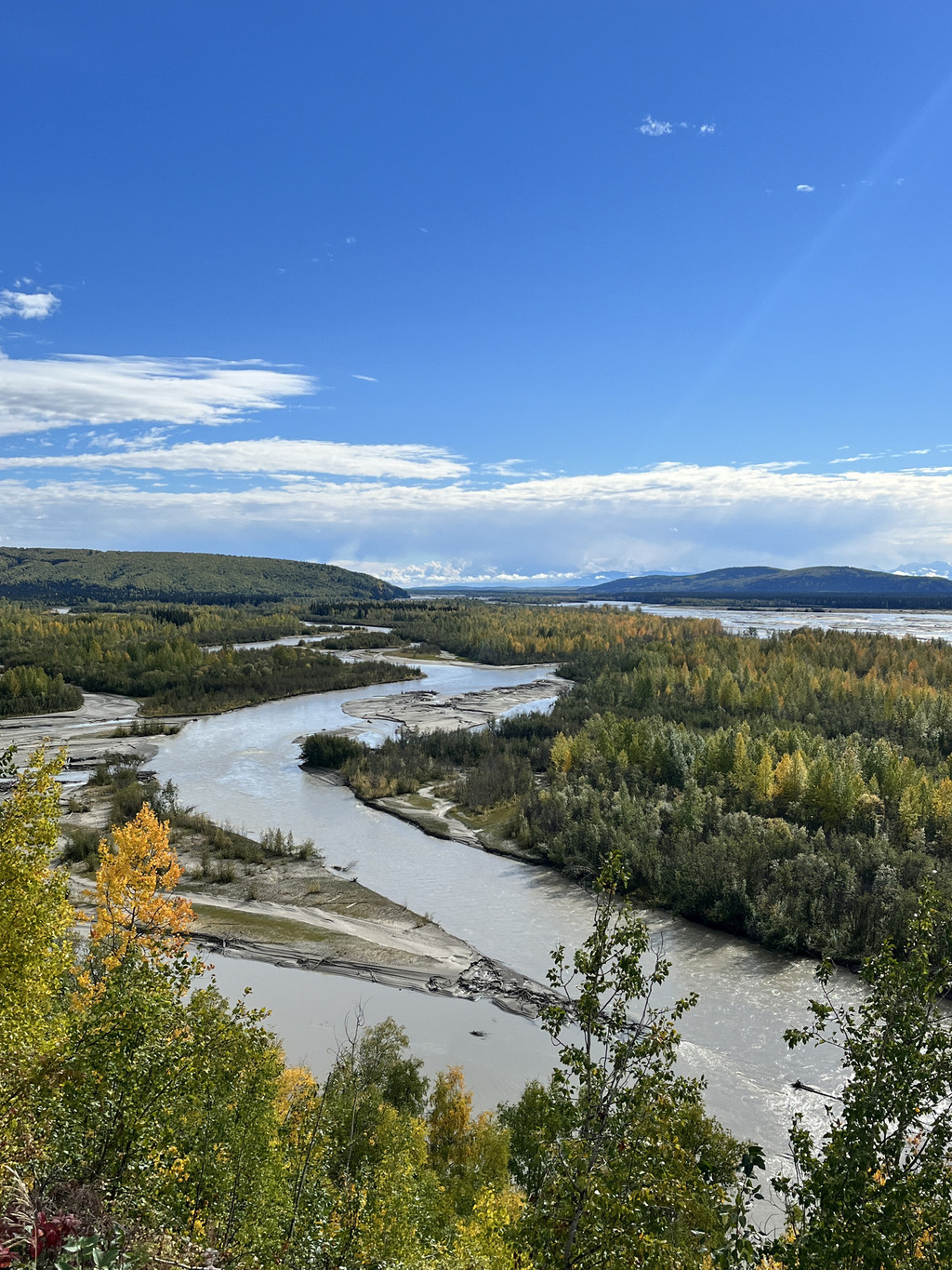 自驾从安格雷奇到费尔班克斯,五百多公里,去时走1号公路转3号公路,回程时走2号公路在Delta Junction(三汇市)转4号公路,全程不走回头路,9月正是阿拉斯加的秋季,这里的秋季一般只有两三周的时间,很短暂,沿途风景美不胜收,尤其回程时的4号公路,远处的山顶白雪皑皑,近处的山体有植被的地方是绿色的,没有植被的山体也许是富含某种矿物质,灰色,紫红相间;道路两边的植物红,绿,橙,黄色彩斑斓;