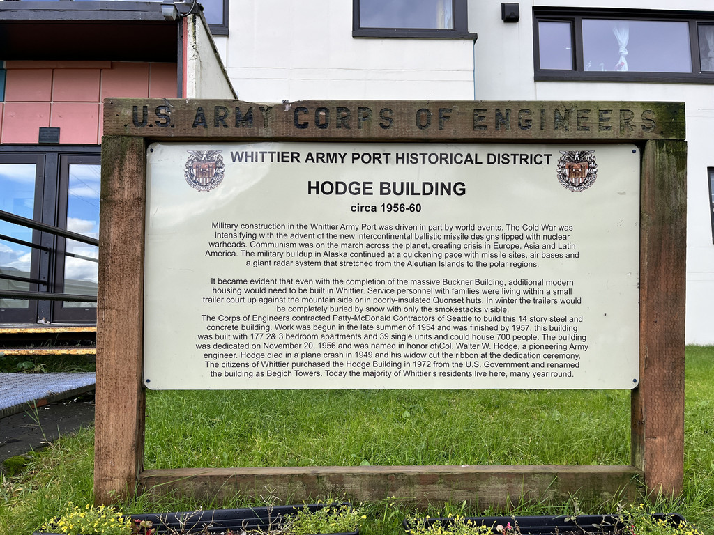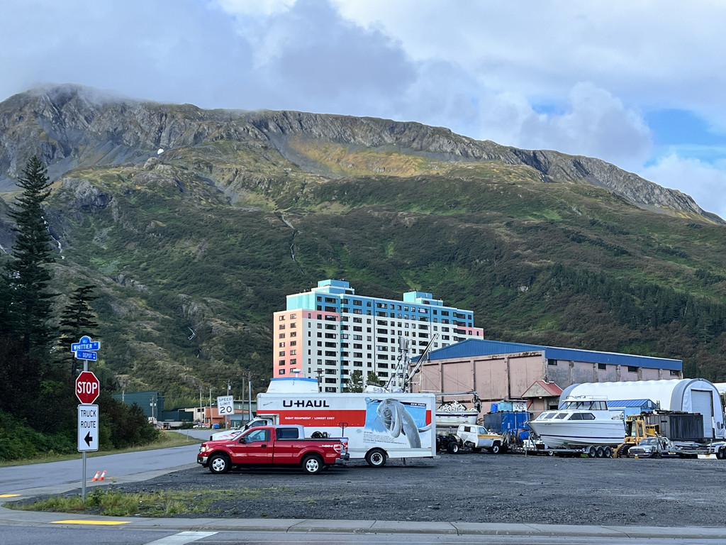 之后再开往惠蒂尔小镇,这是一个港口小镇;一条长约4公里的隧道是连接小镇于外界的通道,每年只有4月初到11月对外开放,11月后阿拉斯加进入寒冷的冬季,海水结冰,游轮无法通行,这个小镇就此进入冬眠状态,小镇居民共同生活在一栋14层楼的房子里,这栋房子里面有学校;医务室;邮局;商店;餐馆等一栋楼就是一个小世界,所以这里被称为全美最孤独的小镇