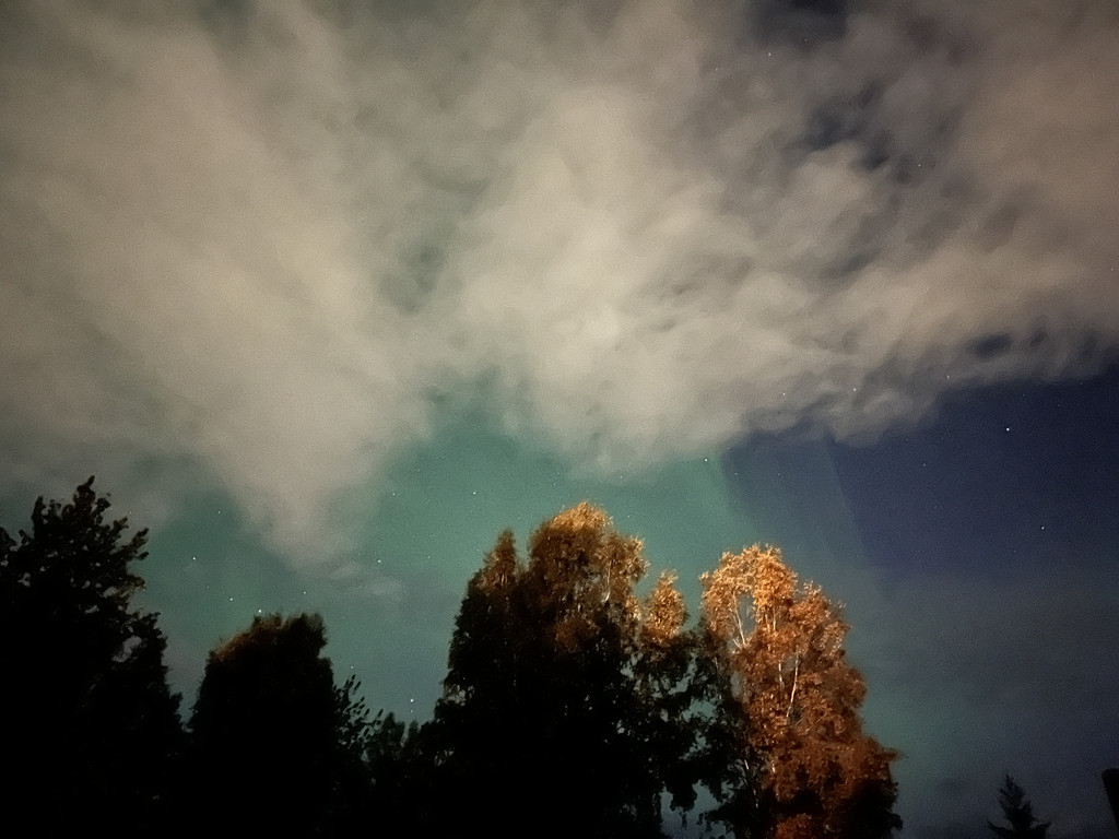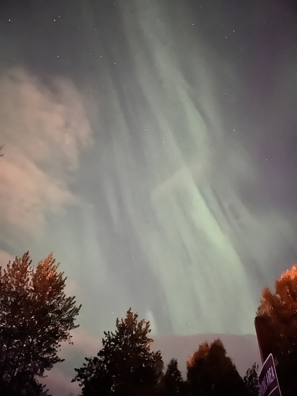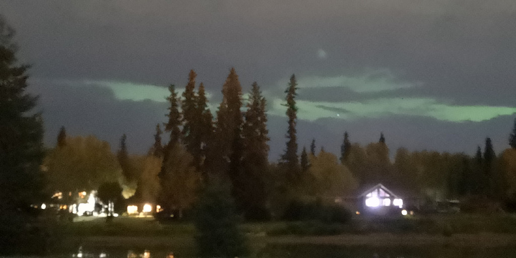 很幸运的在到达费尔班克斯的当天晚上11点后看到了极光,极光最先出现在远处的树顶开始的,没有云朵的地方露出一片翠绿,之后向整个天空蔓延,颜色逐渐转成淡绿,似一层淡绿色的轻幔,只可惜我们刚到费尔班克斯,没有去到最佳观赏点;
