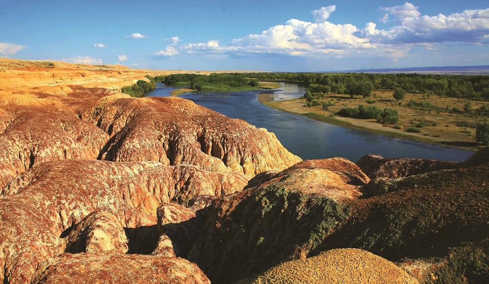 这里北岸山势起伏,颜色多变,充分展现出五彩滩缤纷、色彩斑斓、别具一格的雅丹地貌,额尔齐斯河对岸是葱郁青翠的河谷风光,可谓是“一河隔两岸,自有两重天”。