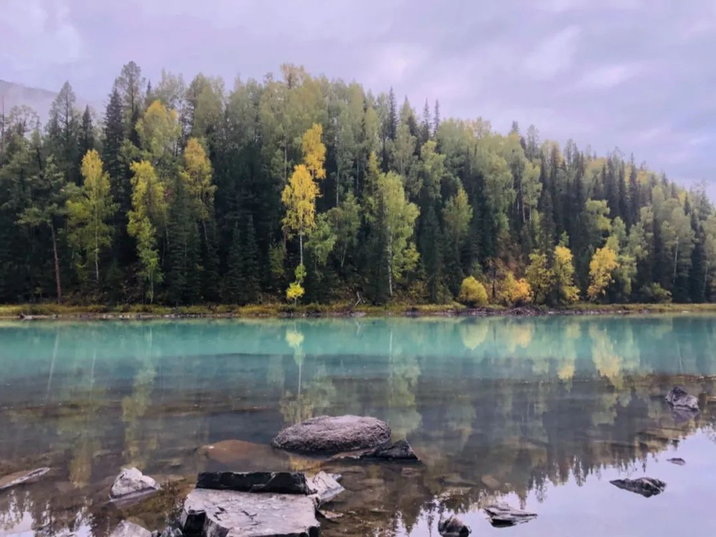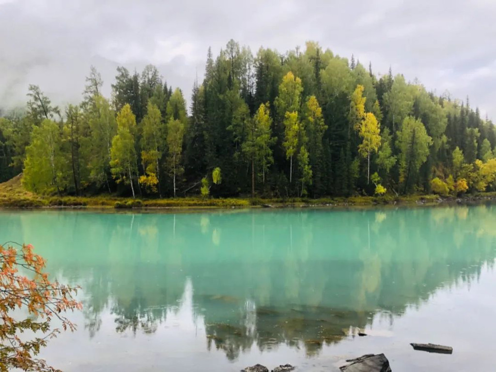 喀纳斯河更是点睛之笔。色如碧玉,像一条玉带缠绕群山。随着河流弯曲蔓延,秋色似乎也跟着流淌起来,延伸到世界尽头。