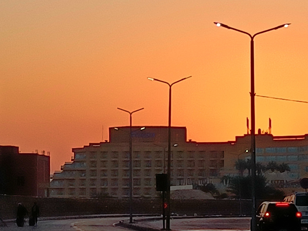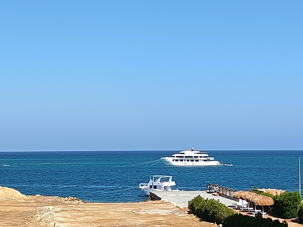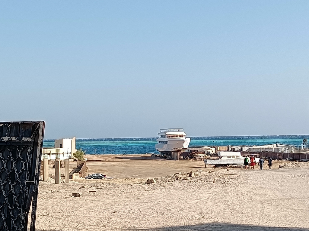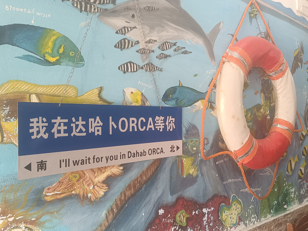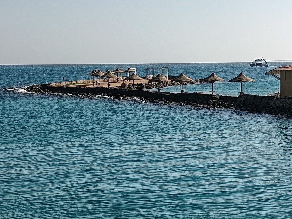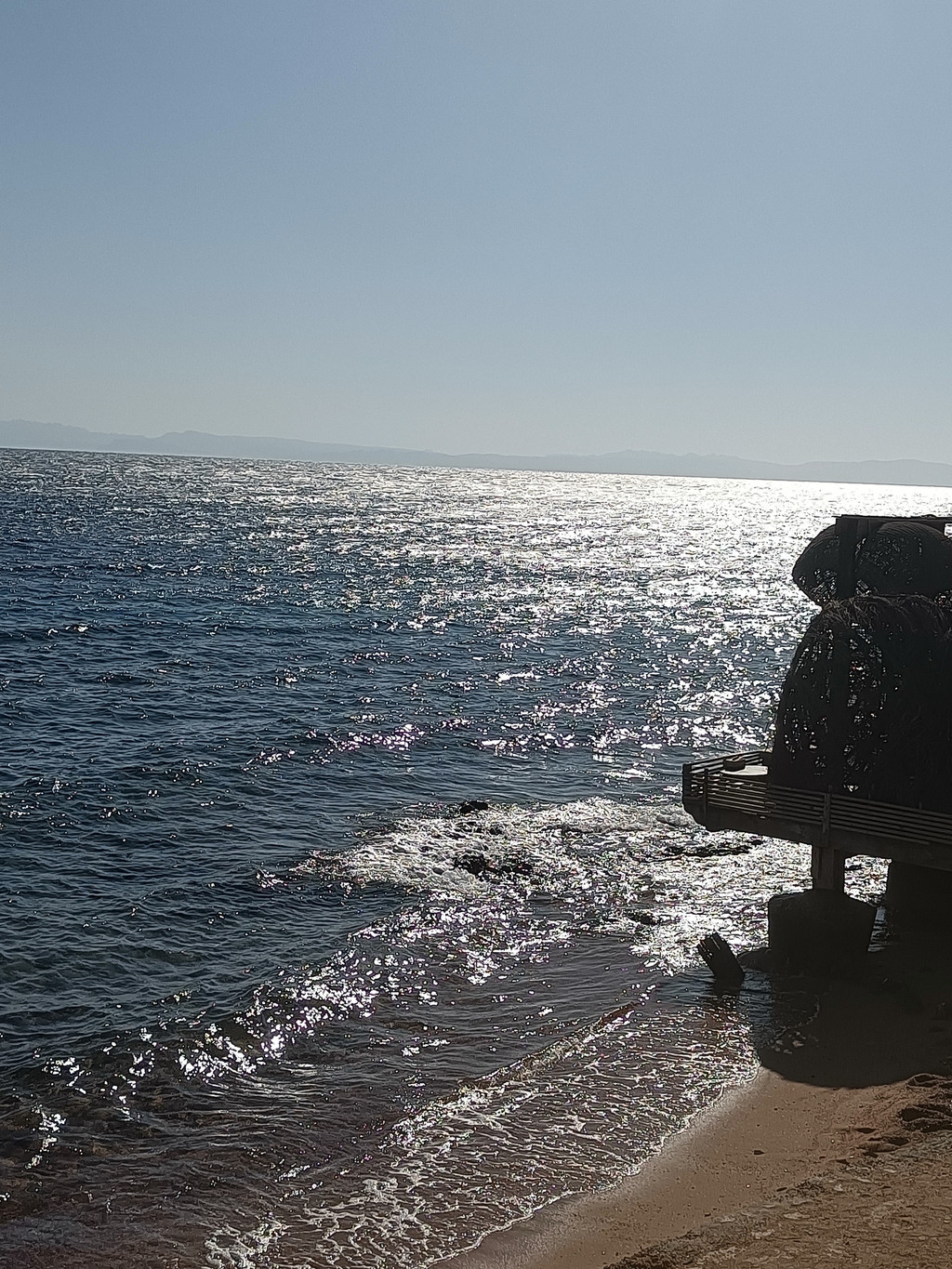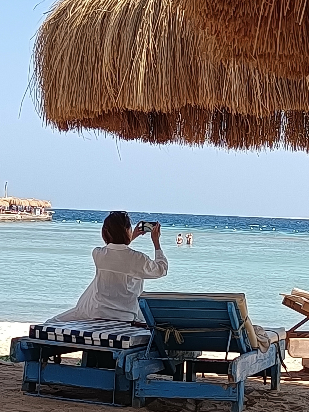 D22(11.5)~这里夜里睡觉还挺冷,盖着被子,并用羽绒服压脚。早5点被生物钟叫醒,去大厅烧上水,先去对面的海滩,有铁门拦着,跟守门的打招呼就让我进去。经过我们昨天吃汉堡的地方,同伴说我们从这离开他也不知道。回到大厅开始喝茶,在那盯夜的大哥(本来叫他大爷,后来发现可能是同龄人)。他问我做什么工作?我说美术老师,并把油画给他看,问我结婚了没有?我答“爱自由!”最高兴是他猜我20多岁,我只能说30了。还给我介绍了埃及的景点,我夸埃及很美,说准备带我妈来住一段时间。他说话口音比较重,无论是英文还是阿拉伯语,翻译软件都不认,我也只分辨出比较简单的。就这样尬聊了将近一个小时,中间猫咪还主动来给我做按摩,我就回屋拿了牛肉火腿片给猫。同伴起床后下来问追海豚的事,他送了我一块小石头,感动!