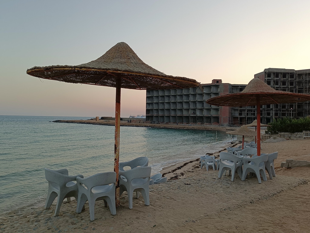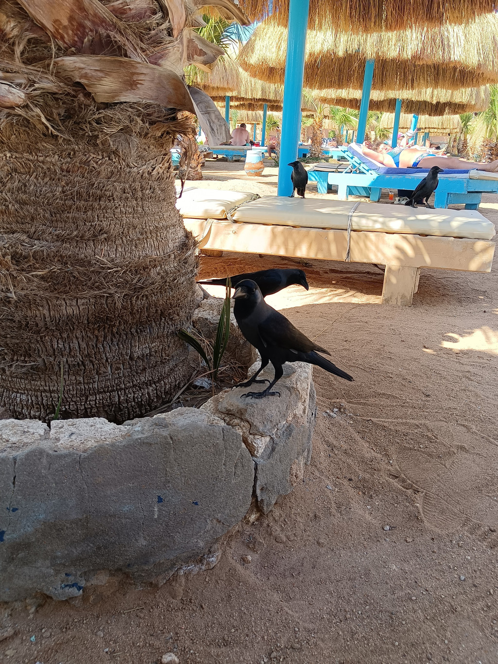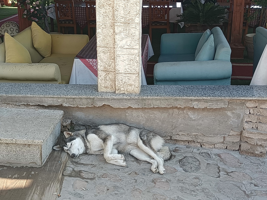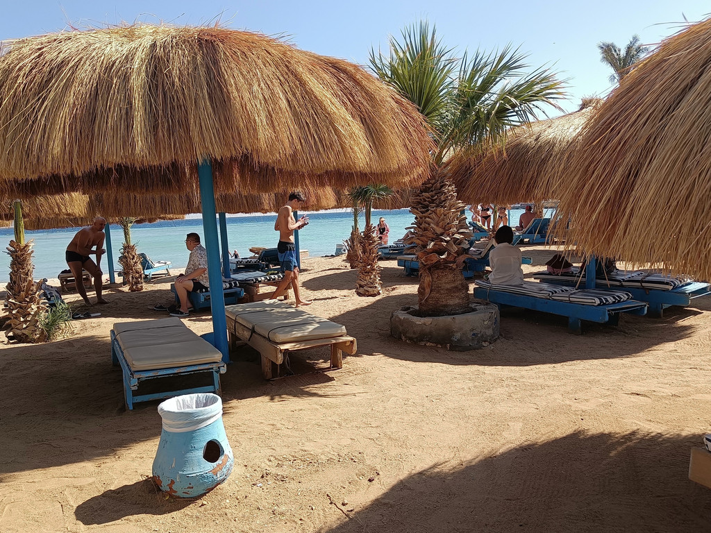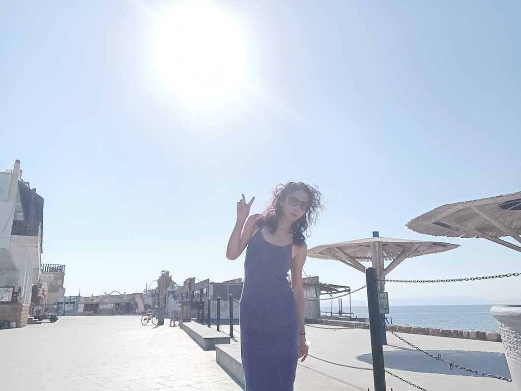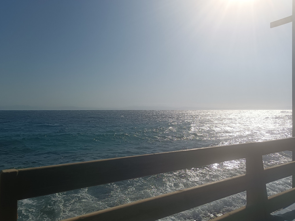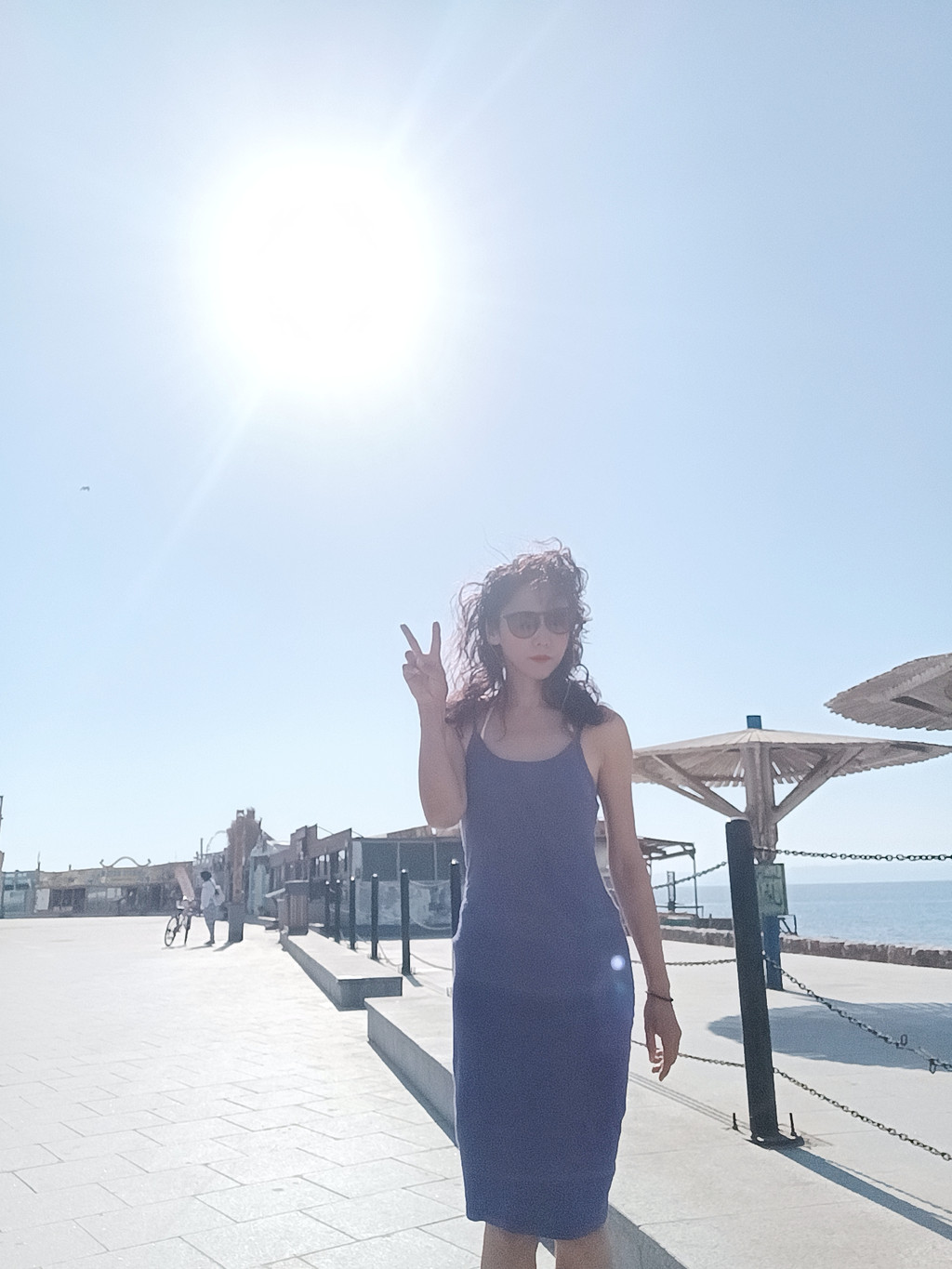 D22(11.5)~这里夜里睡觉还挺冷,盖着被子,并用羽绒服压脚。早5点被生物钟叫醒,去大厅烧上水,先去对面的海滩,有铁门拦着,跟守门的打招呼就让我进去。经过我们昨天吃汉堡的地方,同伴说我们从这离开他也不知道。回到大厅开始喝茶,在那盯夜的大哥(本来叫他大爷,后来发现可能是同龄人)。他问我做什么工作?我说美术老师,并把油画给他看,问我结婚了没有?我答“爱自由!”最高兴是他猜我20多岁,我只能说30了。还给我介绍了埃及的景点,我夸埃及很美,说准备带我妈来住一段时间。他说话口音比较重,无论是英文还是阿拉伯语,翻译软件都不认,我也只分辨出比较简单的。就这样尬聊了将近一个小时,中间猫咪还主动来给我做按摩,我就回屋拿了牛肉火腿片给猫。同伴起床后下来问追海豚的事,他送了我一块小石头,感动!