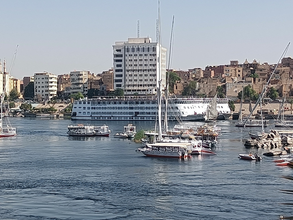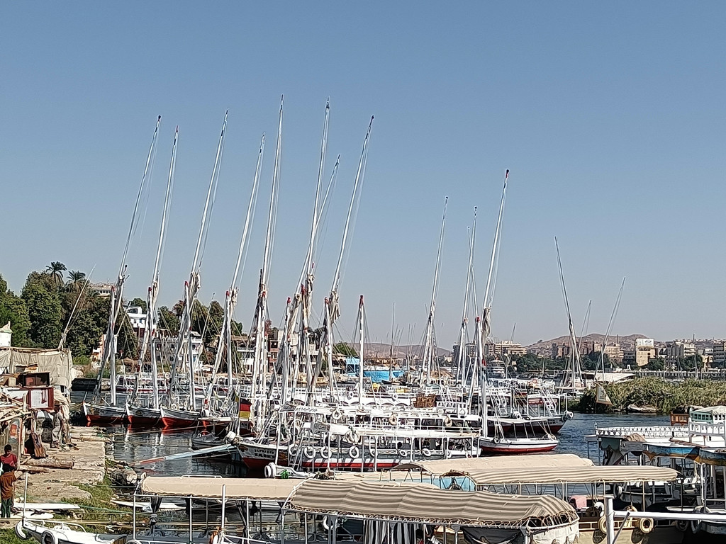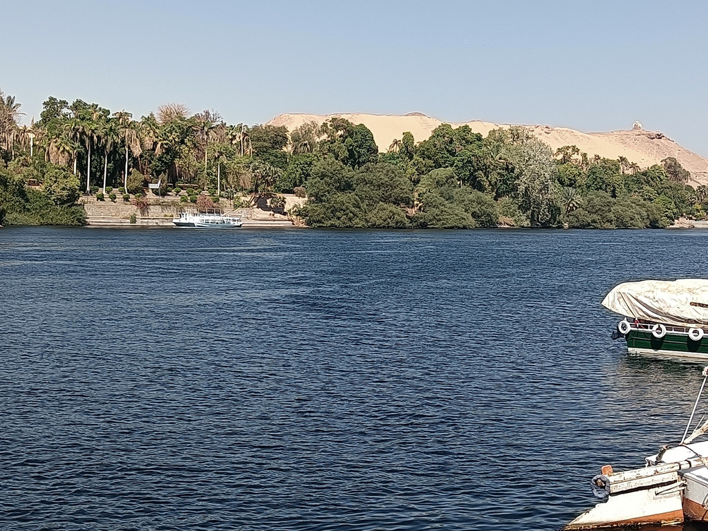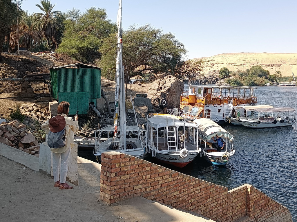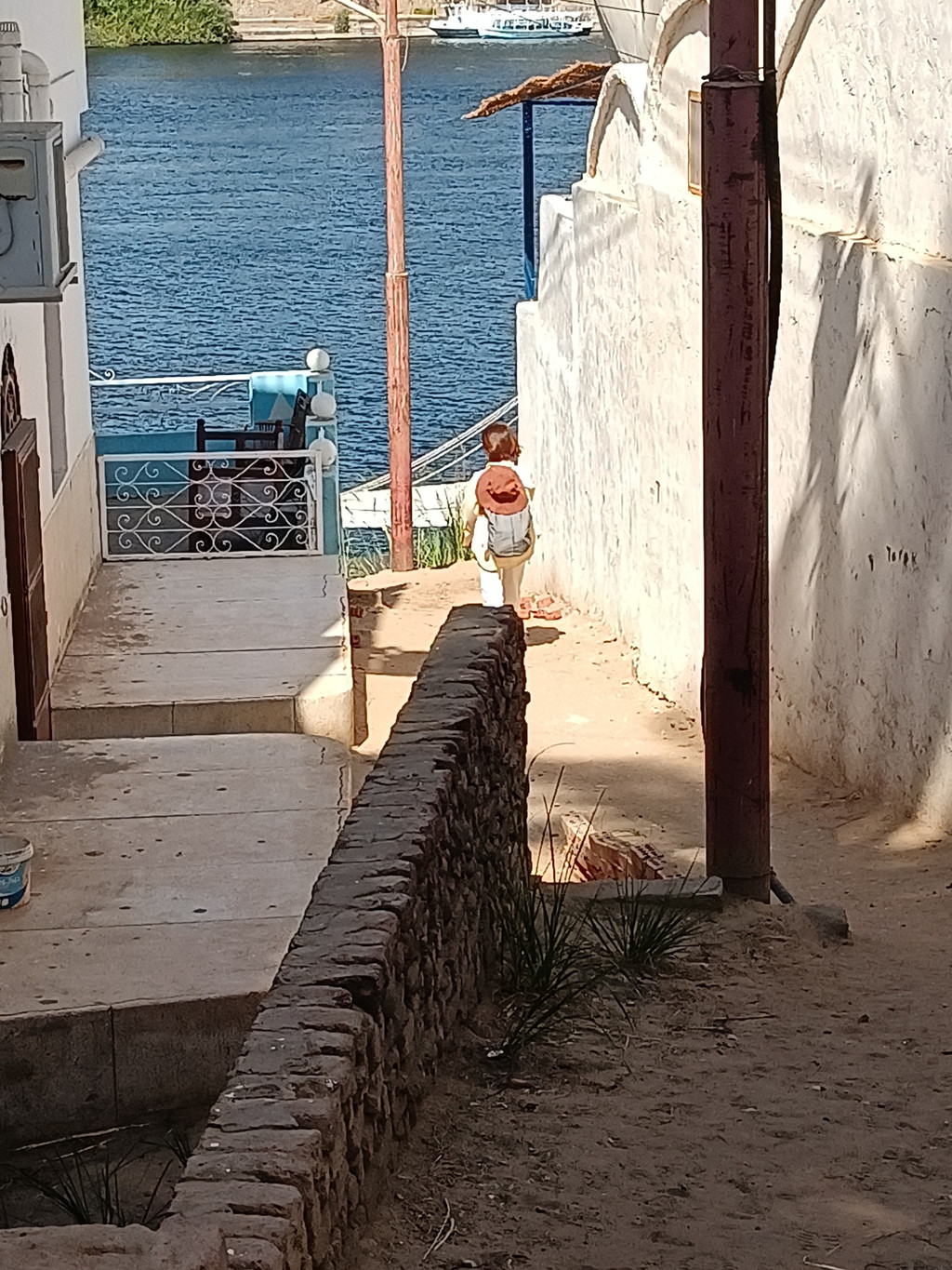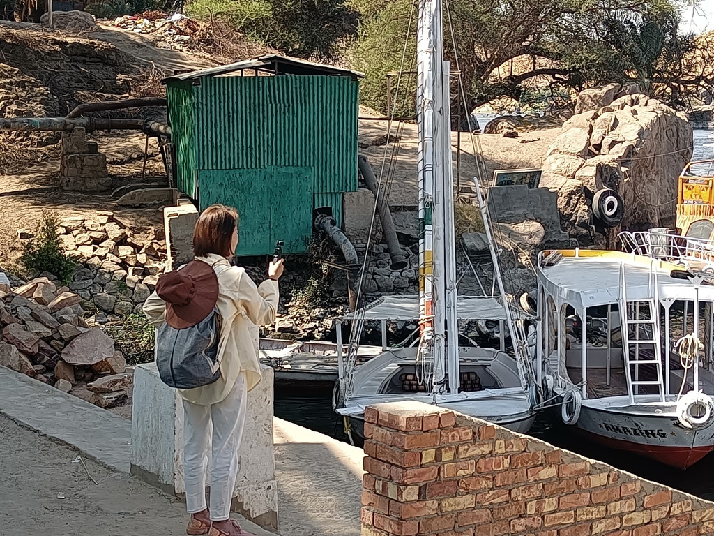 D28(11.11)~收拾好行李放楼下寄存,阿斯旺最后一天。出门坐突突车去尼罗河坐船,开价200,还价40,最终50成交。这次埃及游,我被封为砍价小能手,确实佩服群里花三四千美金的,只是我实在能力有限。埃及人均工资只有两三千埃磅,(官方汇率6.8),我两三千人民币,欧美人士两三千美元欧元,差距就是这么显著。也不拦着他们享受生活,逢人打招呼,求合影,没事就弄杯茶或者咖啡(埃及咖啡难喝,同伴亲身经历),像上次开小巴的司机,路边现煮茶,乘客陪着等。来到尼罗河边,有个人主动搭讪,我们说十块钱,他说十美元,我说no镑,他说英镑,所以管他叫大聪明。公交船10磅一位,男的一侧,女的另一侧。来到大象岛,是努比亚人聚居地,十分安静,有很多欧美旅客住在岛上。房子刷成多巴胺色,偶有几何型装饰,我也换了最后一个造型。面膜、艾灸贴、中国茶、陈皮、清凉油都即将用完,是该离开的时候。可还没离开,已经开始想念,问同伴是否回忆每天路上小朋友问“Hello”,回国后是否需要我每天视频问她。