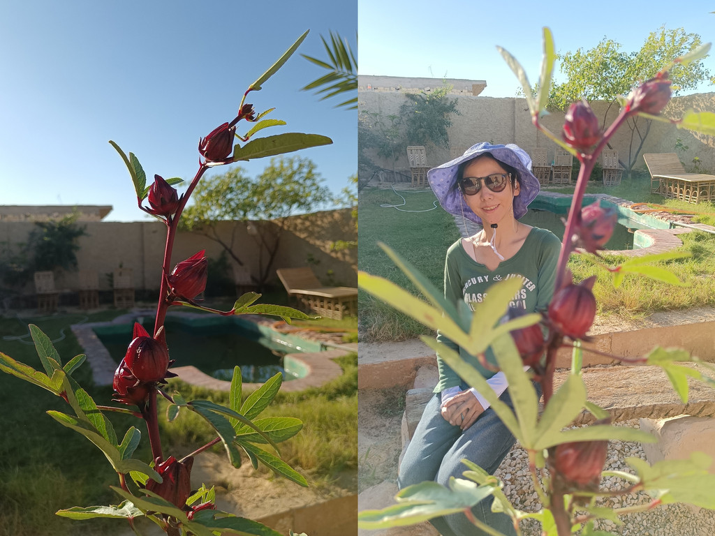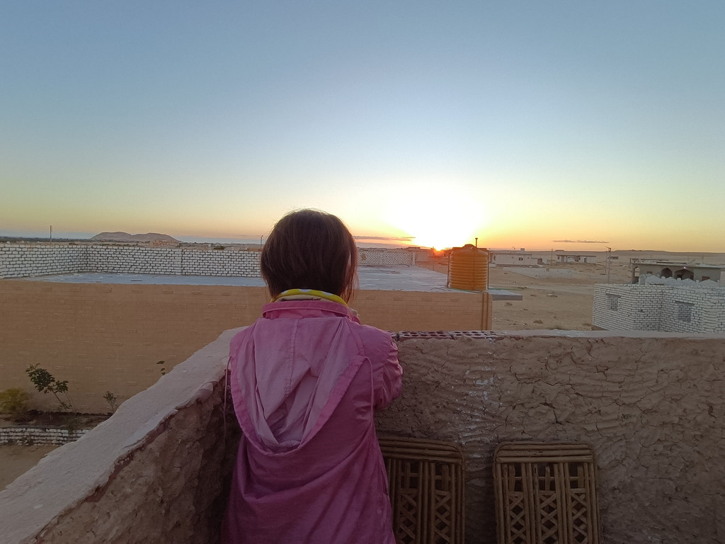 D9(10.23):錫瓦第二天。早晨6点多钟,看到外面已经很亮,就来拍照,拍了好一会,太阳才升起。吃罢早饭,去亡灵山,要门票120埃磅,没进去,和同伴就在外围拍照。还去了大巴和小巴的车站,然后是錫瓦古城,即电影《刺客信条》拍摄地。午饭同伴本来想点炒饭,结果翻译得不对,是鸡肉和小米同煮,结果大部分都让我吃了。大哥跟民宿老板提议去他父母家看看。到了后我们送上清凉油,主人奉茶,喝了一巡后同伴去拍了他家的奶牛、绵羊和山羊,回去之前,送了我一支洛神花,给我美得不行不行的。