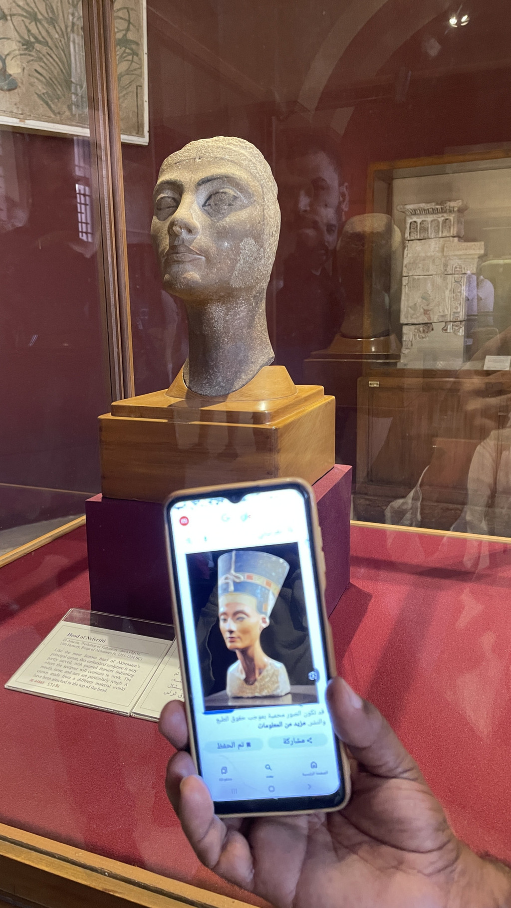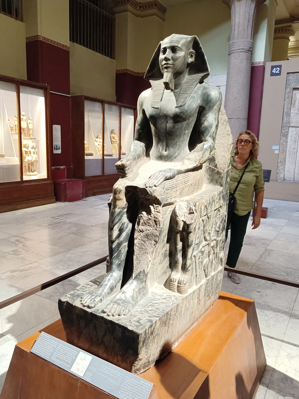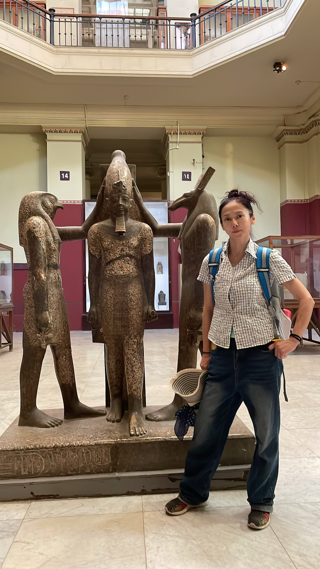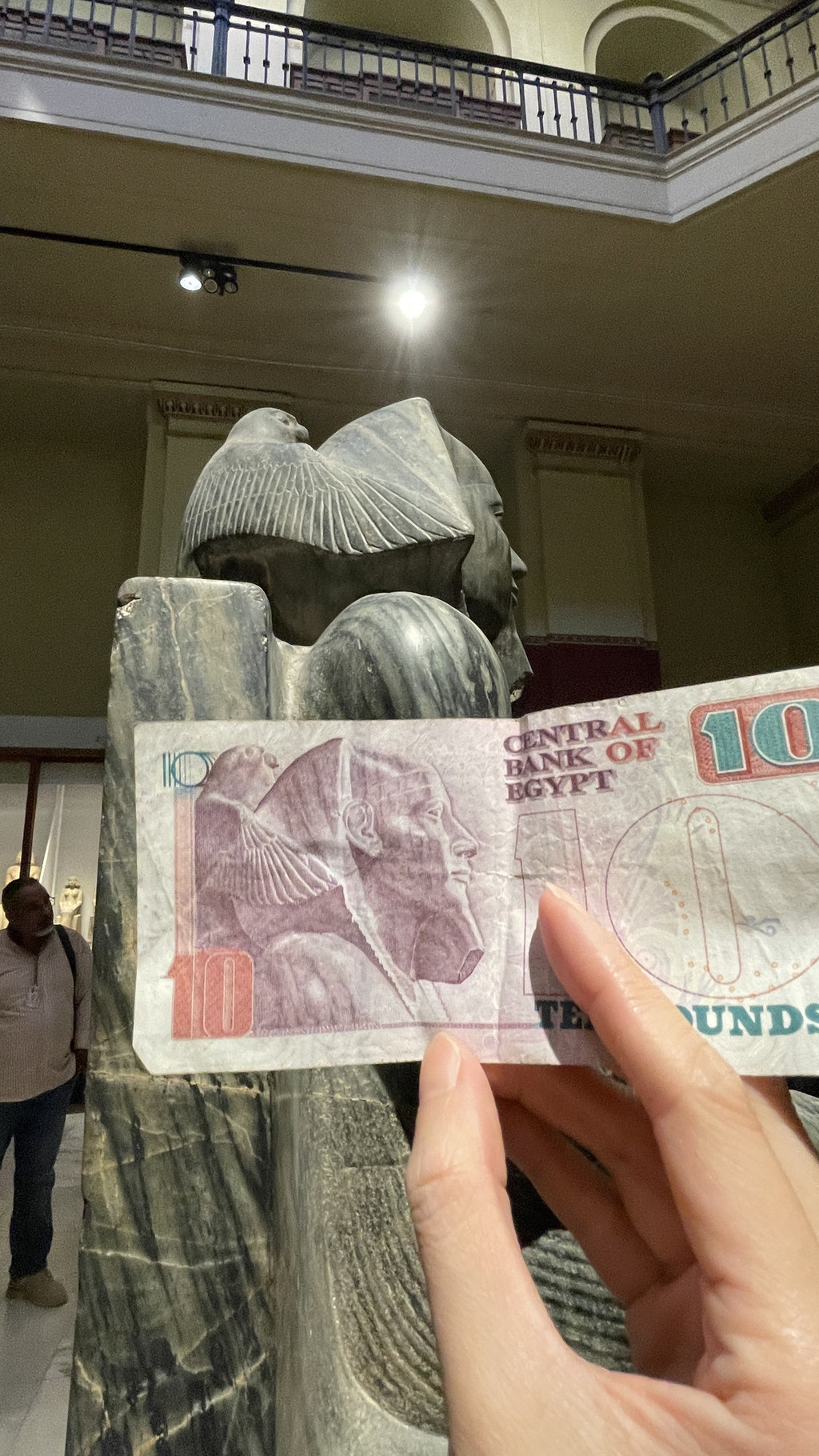 D2:开罗第二天~埃及博物馆。门票刷卡450埃磅,每个人门票的图案不同。以前,景区门票还可以让埃及人代买,再给他挨镑的现金。但是有好多人就装自己腰包了,然后政府也收不到钱,所以现在所有的门票都是必须刷卡,有VISA和马自达卡。我们请个中文讲解,否则看半天也看不出所以然。他讲得不错,还会提问,也会讲笑话,只是中文说得有些口音,我就在旁边翻译。幸亏以前有给香港导演做翻译的经验。为了不耽误导游的时间,我们先跟着他听,后来细细又逛了一圈。合影后想约最后回开罗去参观新开张的博物馆。体力、精力的付出加知识点的狂轰乱炸,我们三点才出去吃饭。又是在北京一年吃不到一次的垃圾食品,吃得太饱,连晚饭都省了。