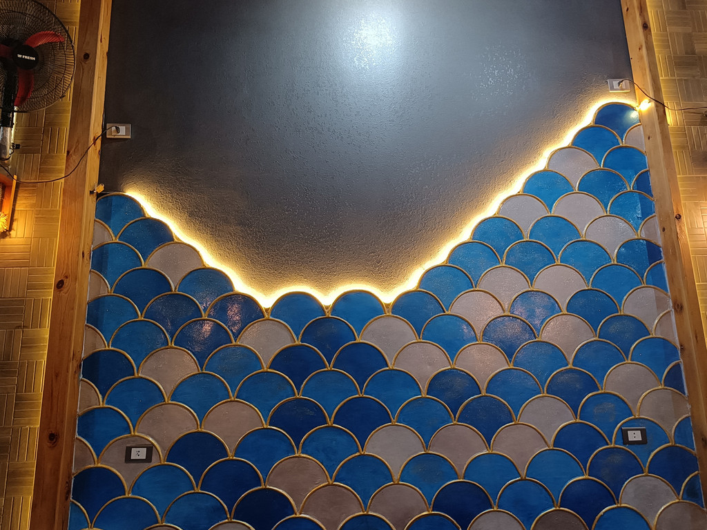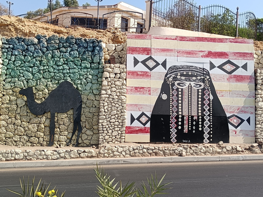 D19(11.2)~陪同伴去潜店,她今天去蓝洞。自拍完毕,去询价浮潜,有说装备加人600磅,有说陪伴20美金的。走啊走,最后问到只租装备100磅。回家取毛巾和换的衣服,带上姜煮可乐,就去了。老板说,我穿脚蹼得倒退走下去。果然经过上次,没有那么怕水。面镜依然会进水,并不慌张,先玩了半个多小时,近海就有很多鱼,晒会太阳。还想再玩一小时,无奈两条腿相继抽筋,只得遗憾结束。看到了数十种鱼,还有挺大只的。/图9,你说这埃及人也挺逗的,请不起设计师,就自己弄个大色块做装饰