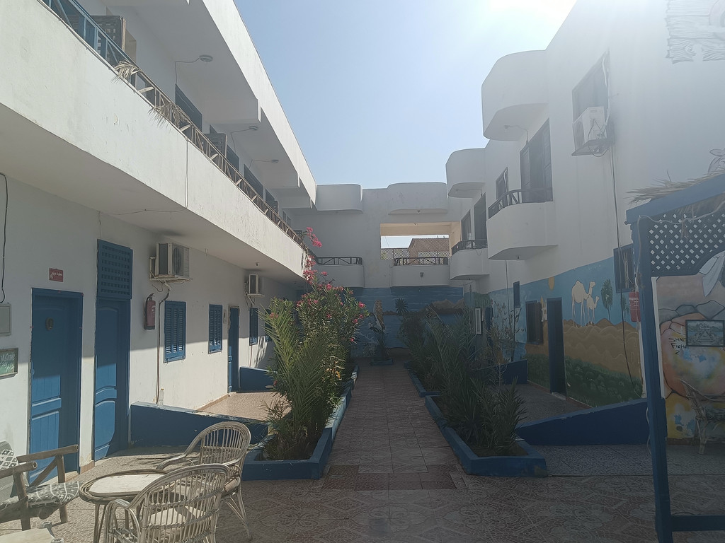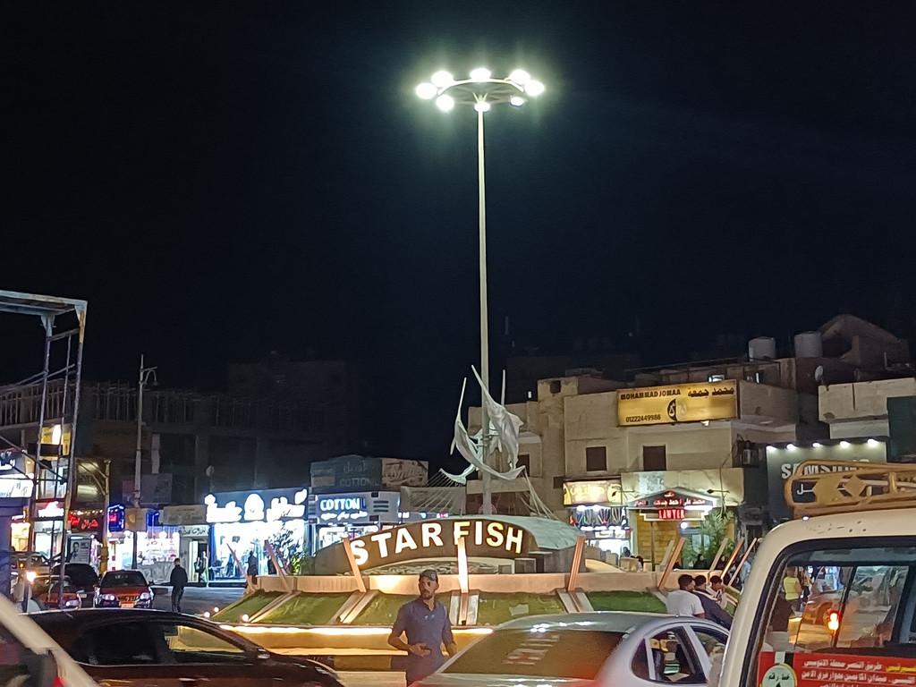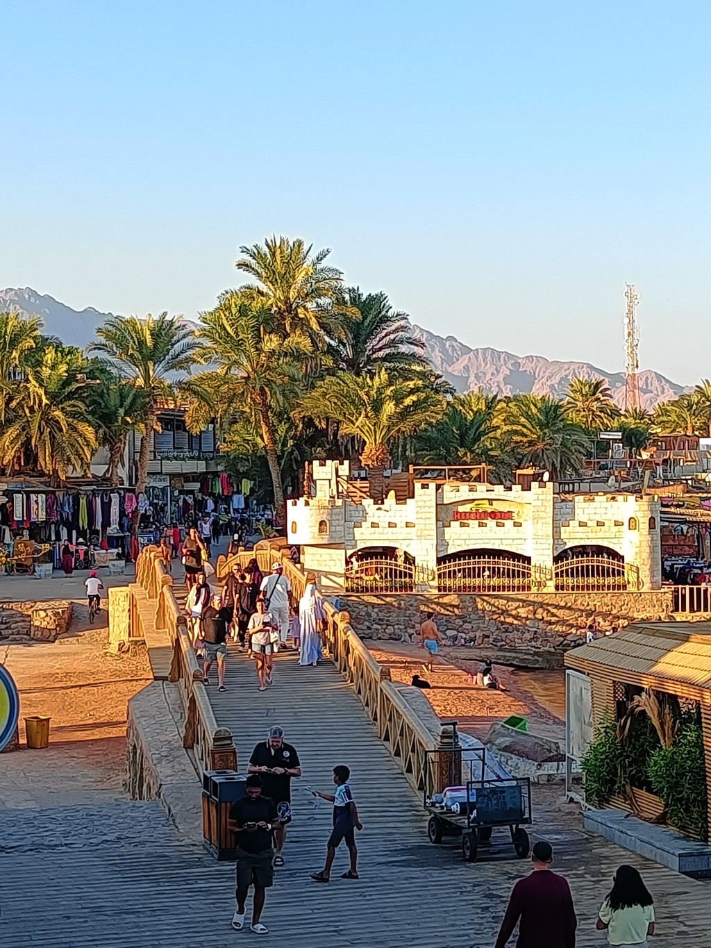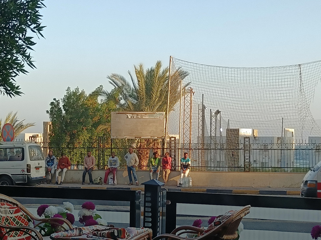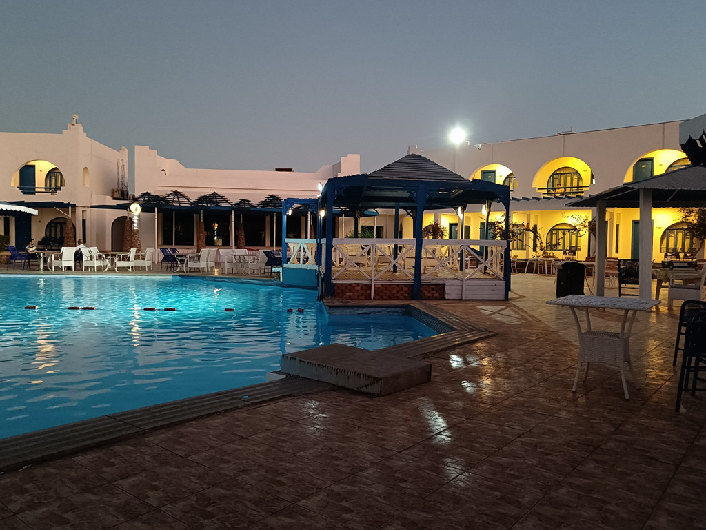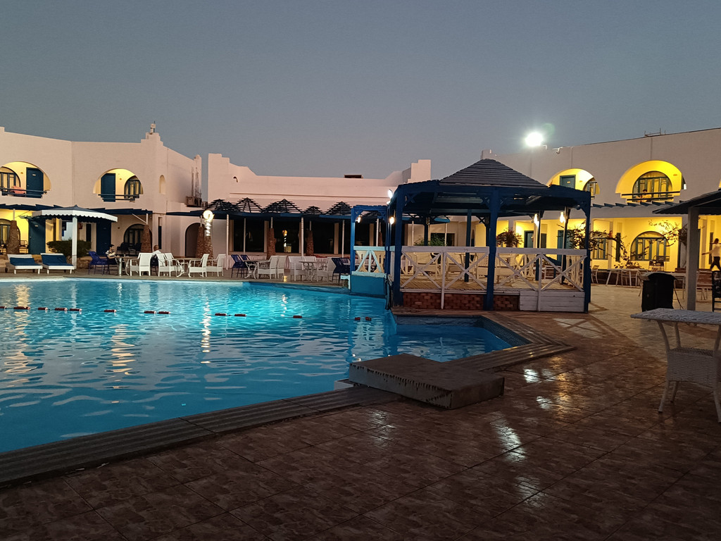 D13(10.27)~查找大巴站点,距离近的只有10点班次,就来到解放广场,买到了8点半,330埃磅一位的,漫长的旅程,时间紧的也可以选择机票。途中两次查行李,9个小时车程来到沙姆沙伊赫,酒店19美元一晚,也是合每人70元。放下行李去干饭,谷歌地图找到这家餐厅,可火了,不停地翻台。共980埃磅,但是收一千,其它算小费,核144元,每人72,连第二天早饭都有。饭罢去逛街,同伴买沙滩鞋和水果。我眼瞅着山坡上酒店,准备抄近道被制止,明天白天再试吧。回来在泳池前泡茶,还有DJ放阿拉伯风音乐。