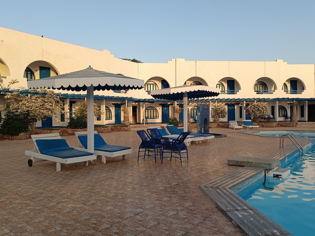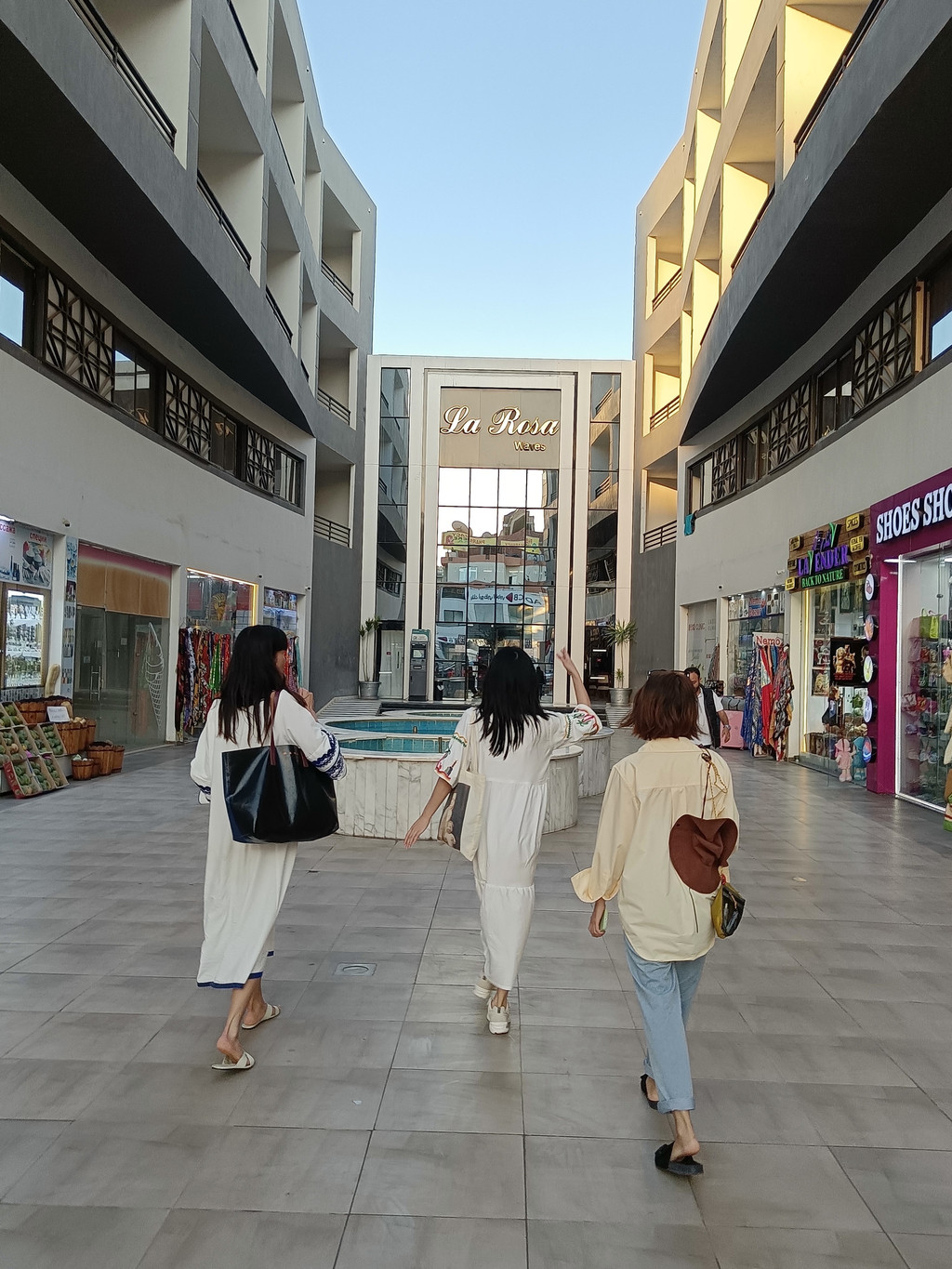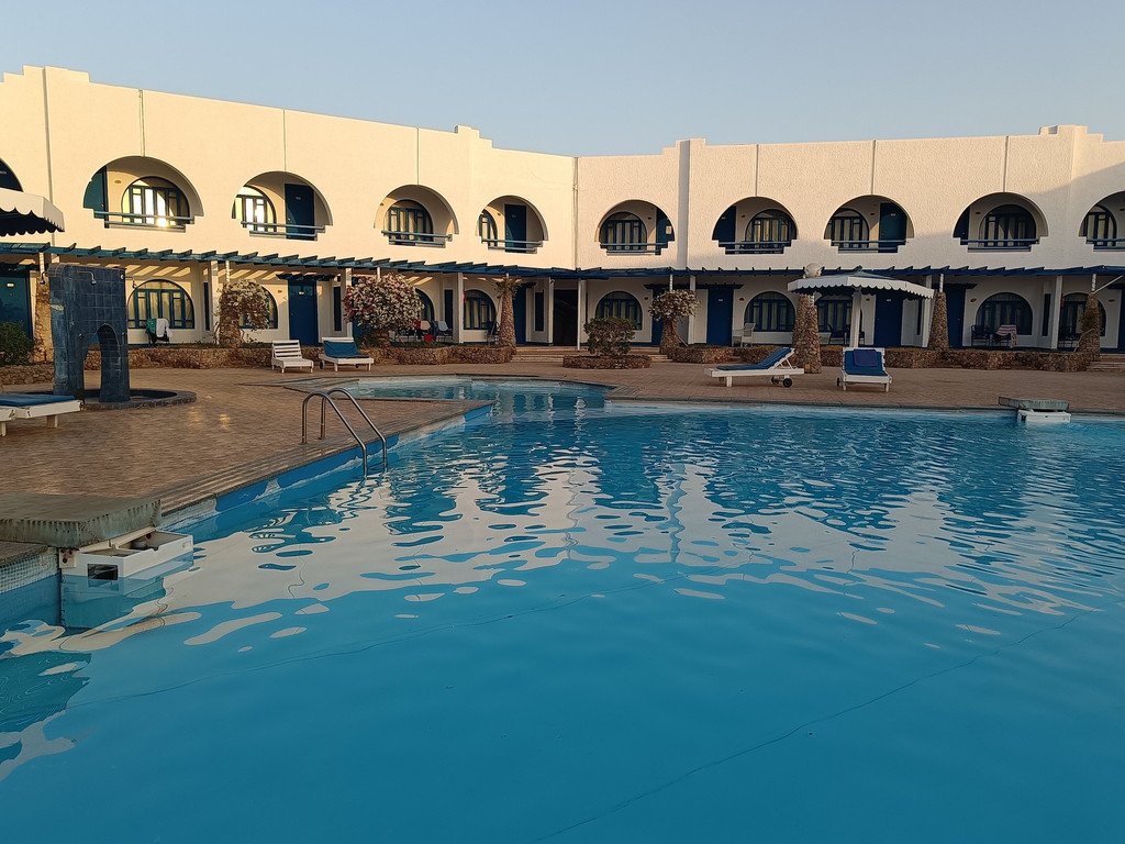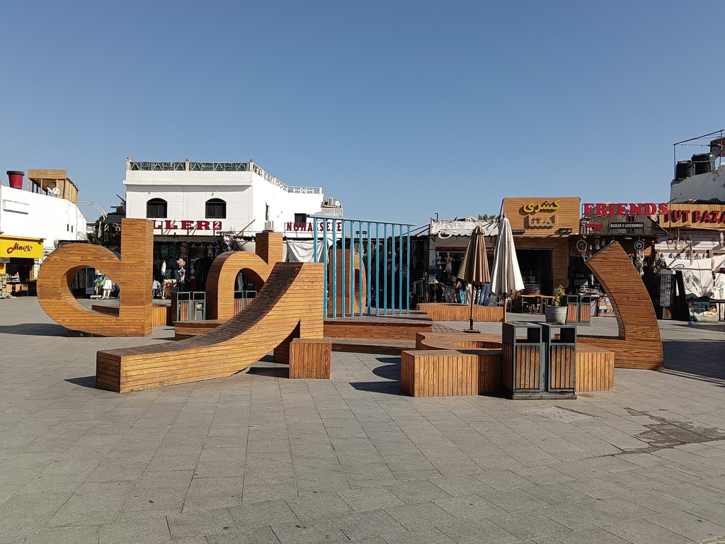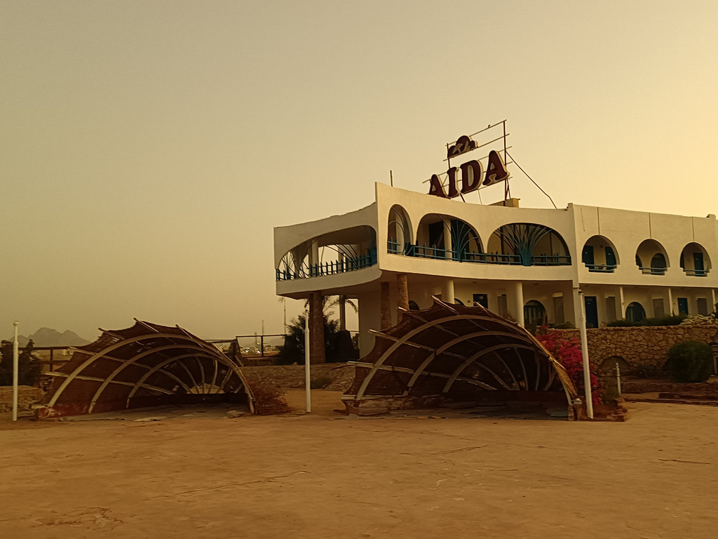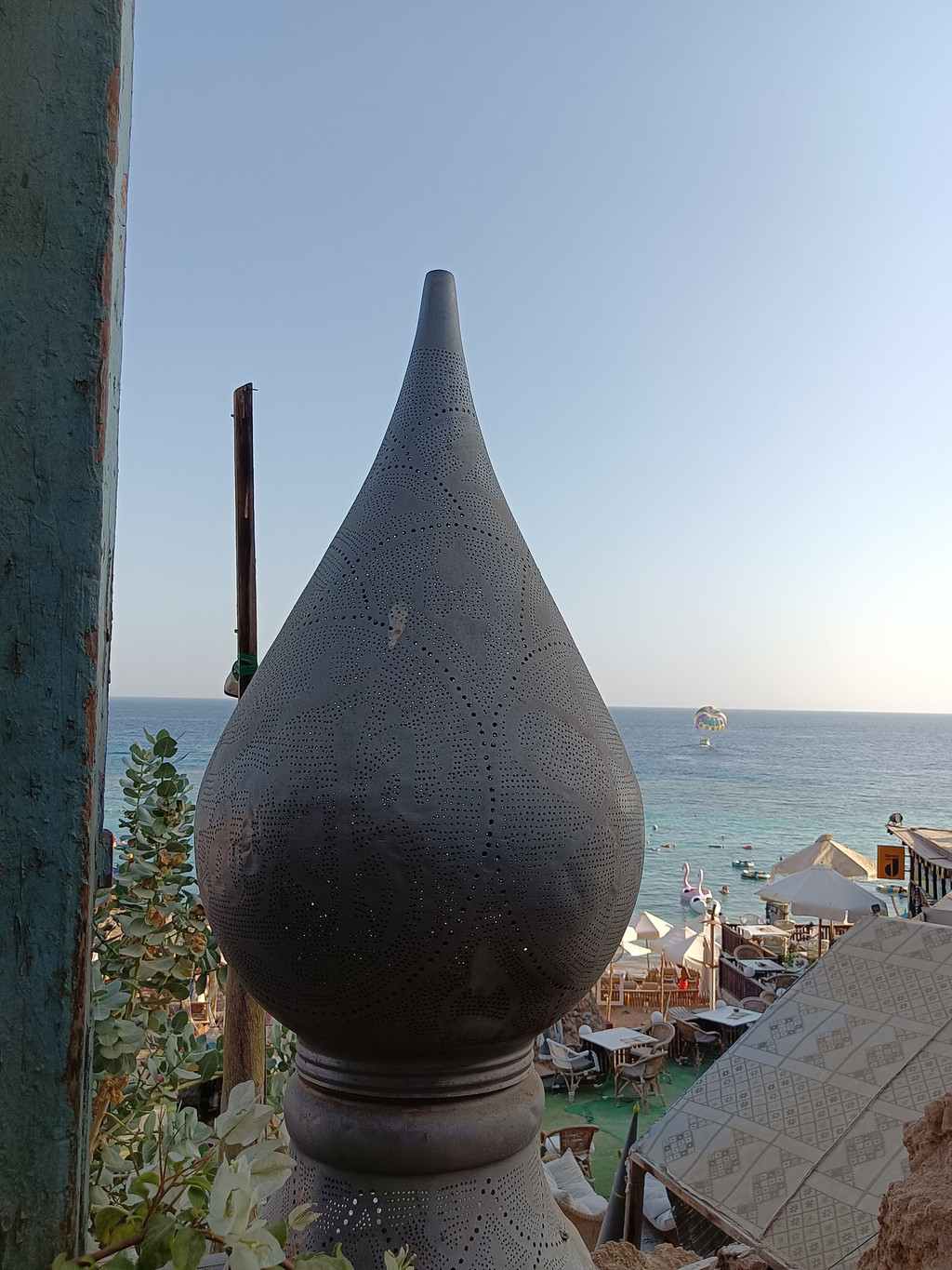 D13(10.27)~查找大巴站点,距离近的只有10点班次,就来到解放广场,买到了8点半,330埃磅一位的,漫长的旅程,时间紧的也可以选择机票。途中两次查行李,9个小时车程来到沙姆沙伊赫,酒店19美元一晚,也是合每人70元。放下行李去干饭,谷歌地图找到这家餐厅,可火了,不停地翻台。共980埃磅,但是收一千,其它算小费,核144元,每人72,连第二天早饭都有。饭罢去逛街,同伴买沙滩鞋和水果。我眼瞅着山坡上酒店,准备抄近道被制止,明天白天再试吧。回来在泳池前泡茶,还有DJ放阿拉伯风音乐。