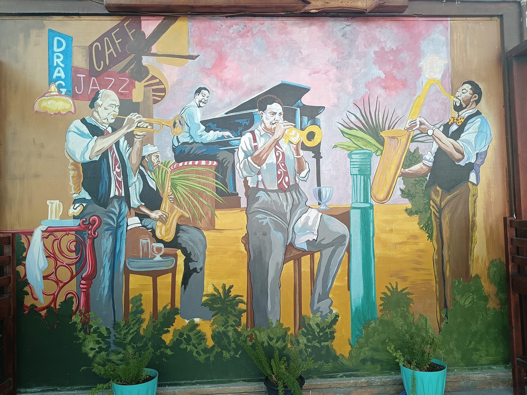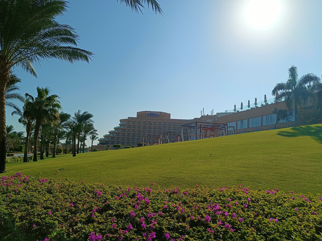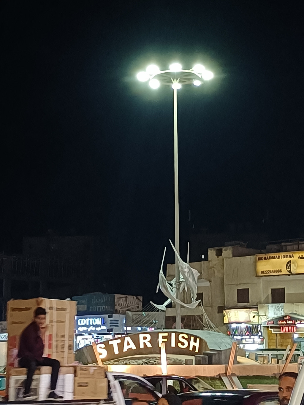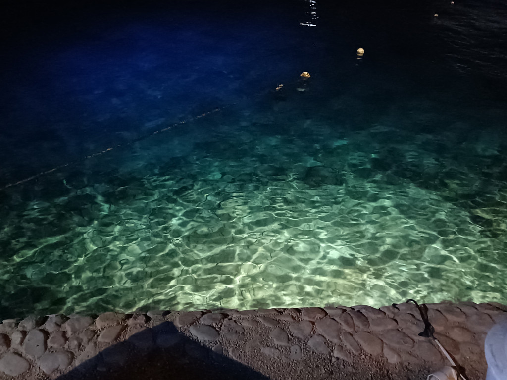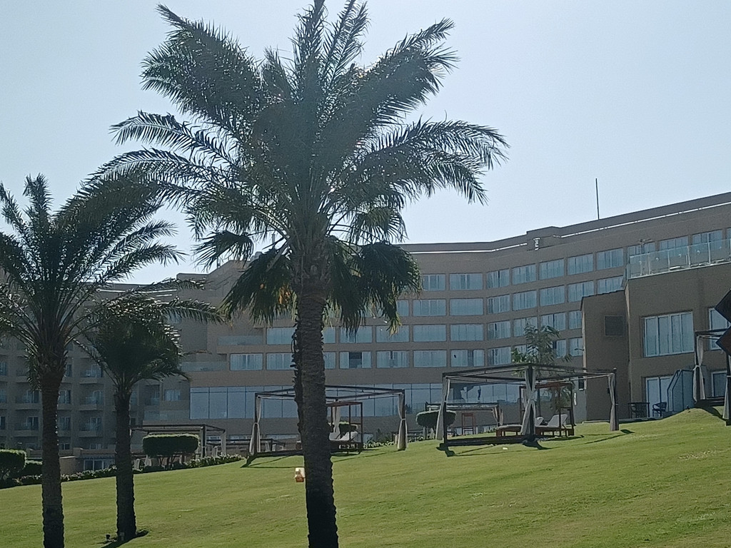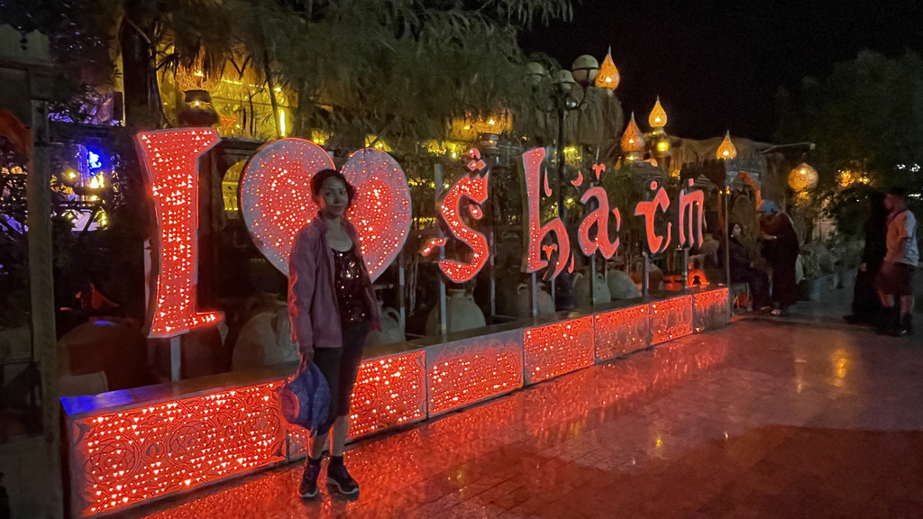 D13(10.27)~查找大巴站点,距离近的只有10点班次,就来到解放广场,买到了8点半,330埃磅一位的,漫长的旅程,时间紧的也可以选择机票。途中两次查行李,9个小时车程来到沙姆沙伊赫,酒店19美元一晚,也是合每人70元。放下行李去干饭,谷歌地图找到这家餐厅,可火了,不停地翻台。共980埃磅,但是收一千,其它算小费,核144元,每人72,连第二天早饭都有。饭罢去逛街,同伴买沙滩鞋和水果。我眼瞅着山坡上酒店,准备抄近道被制止,明天白天再试吧。回来在泳池前泡茶,还有DJ放阿拉伯风音乐。