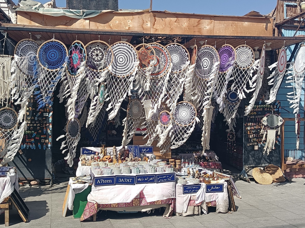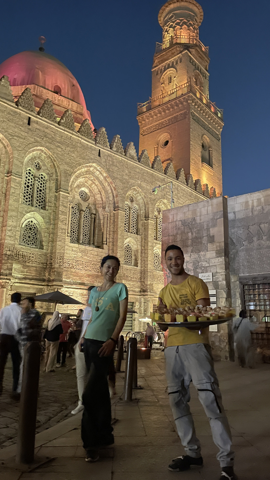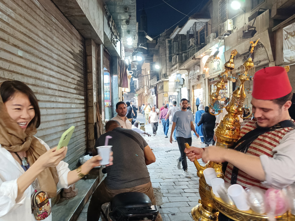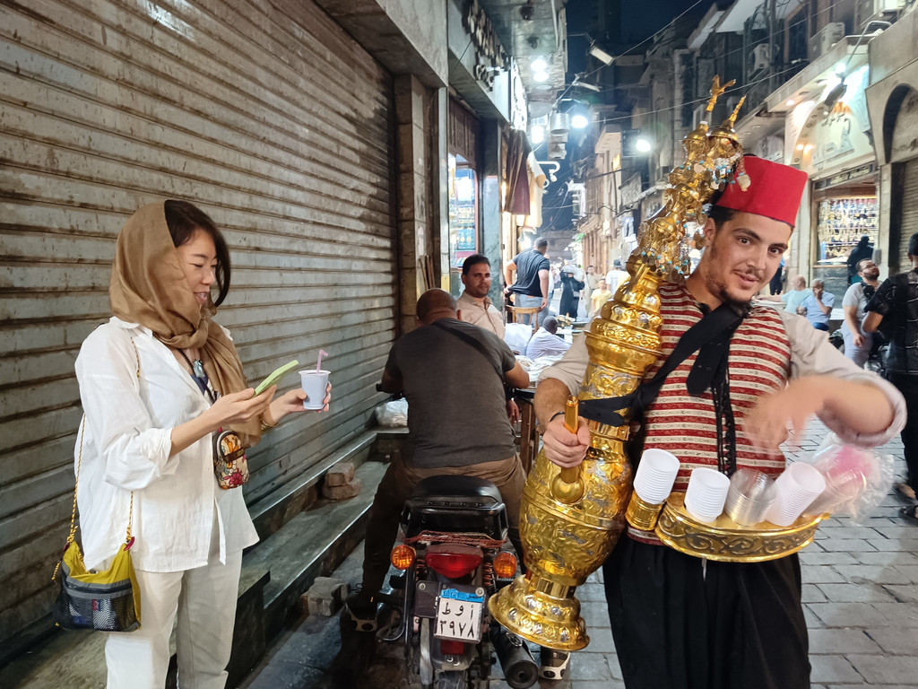 D2(10.16):开罗第二站~哈利利市场。吃完下午餐,回酒店略微修整,出发哈利利市场。真正体验了埃及风格拉锯式砍价,图中的镯子,开价800磅,我们还的价他不接受,离开又走回去,好几个回合,最后250成交。中间的语调分贝数极高,想不到砍价也是体力活。同伴因为图2小胖的笑容所迷惑,把50磅的葡萄汁听成了15磅。往里走,有一个彩色照明的清真寺,歇会拍照,还不时有人入镜。后面再走,相继出现小吃和冰淇淋,我们选择喝茶,两杯100磅。说了什么笑话,使我笑到模糊呢?