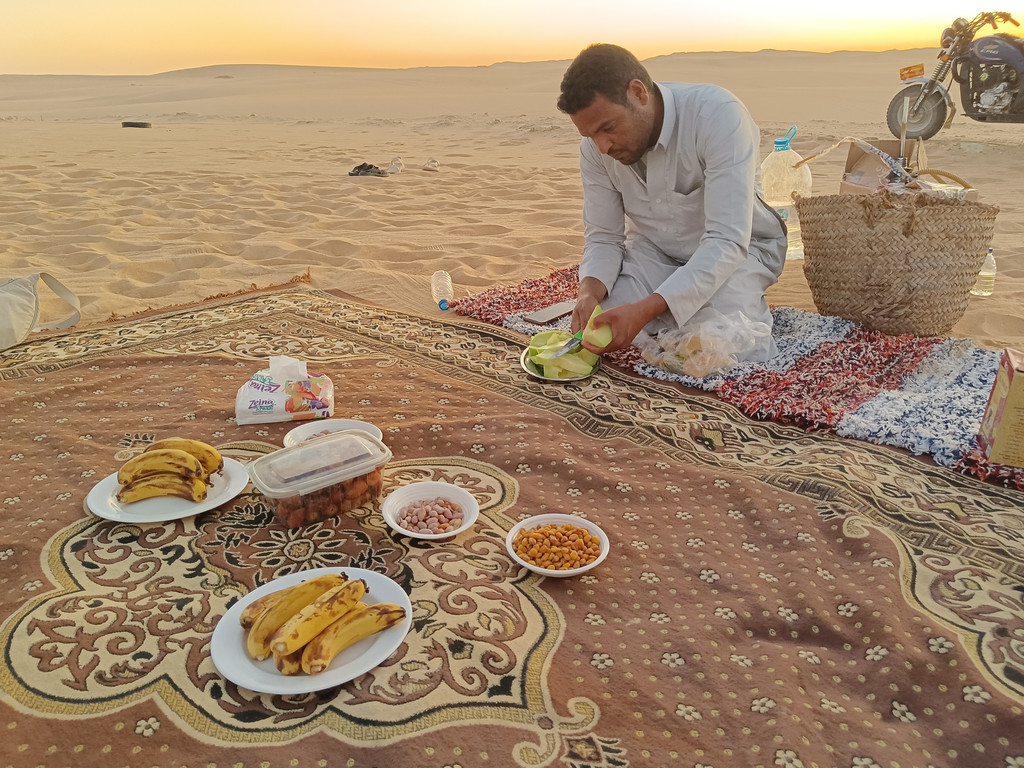 D10(10.24):錫瓦第二天。回到驻地稍事休息,出发沙漠看日落。开车2-3公里,就到了“撒哈拉大沙漠”,小时候三毛的书名印象较深。老板准备了茶和瓜果,在不远处生一个小火堆煮茶,女朋友抽得可高兴了。这边日落好快呀!天黑一会就有星星陆续出现,直到满天繁星,气温也一点点降下来,我准备的羽绒服,正合适。因为要回来收拾行李,20点多我们就结束了。今天5点多醒,收拾停当,老板已经准备好早餐,第一天谈价钱时寸土不让,到结账时他可大方了,也许他真的喜欢我女伴呢!两晚住宿加两个半天的景点,去他父母家参观,再加日落和观星,才收我们3500埃磅。更巧的是,他居然就是我做攻略看游记的主角,(其实并不是我订的房)真是缘分!