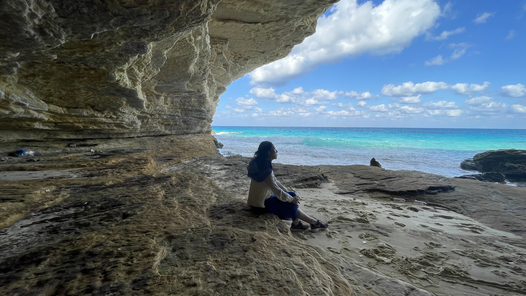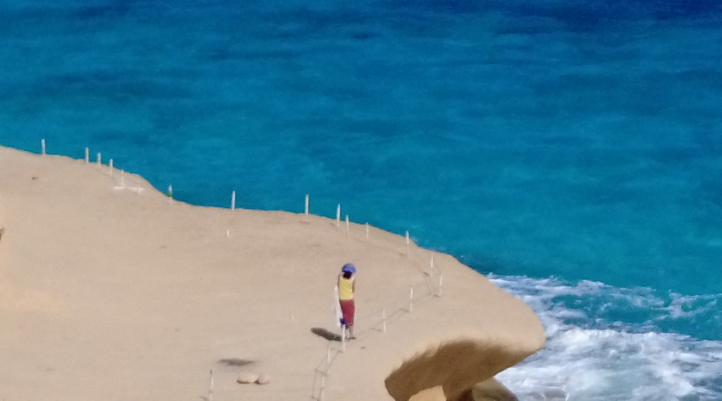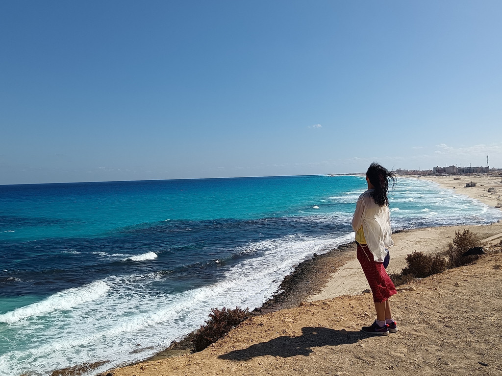 D7(10.21):马特鲁第三天。今天的早餐相当的充实,以至下午四点都不饿。没人接单,拦了辆车,200磅来到最美公路。我们拍了会照片,正歇着时,有人说用沙滩椅要收钱100埃磅。一位当地的美女听说,还要去理论,真是太热心!我们正好往礁石深处走,越走风景越美。且碰到一对中国人,贴心地帮我们拍了合影。