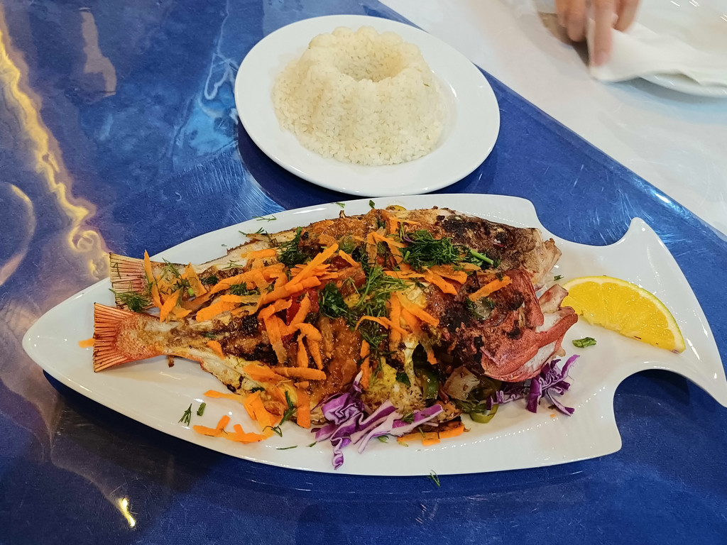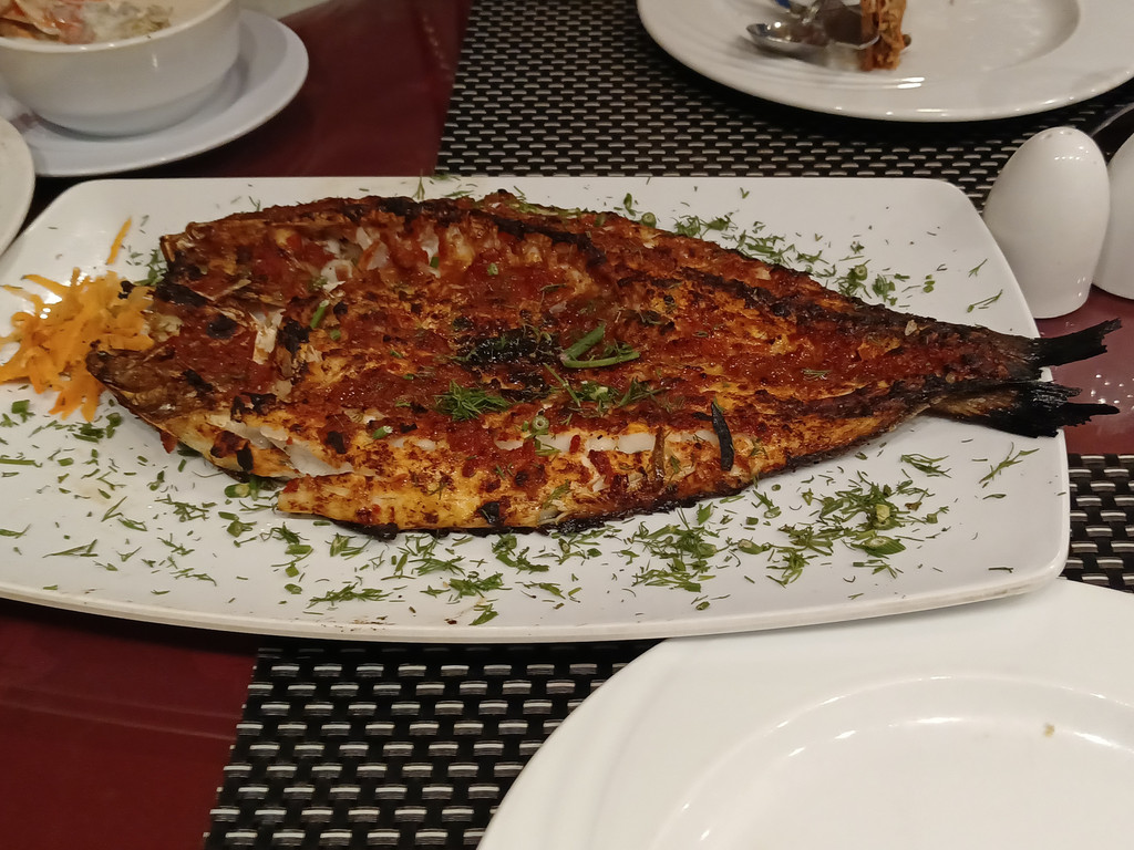 D22~23(11.5-6)~从海滩出来,我们说找个追海豚的旅行社。第一家开价25美金,各项加起来需要65美金,砍砍价也只砍到1920磅,还是觉得有点贵。碰到第二家,开价800,最后停留在600磅每人。旅行社的哥们还把我们送到第二天等的希尔顿门口。去家乐福补充了面膜后,回酒店略微修整,出发去吃海鲜晚餐。要了两条鱼,结账586磅,核人民币85元。