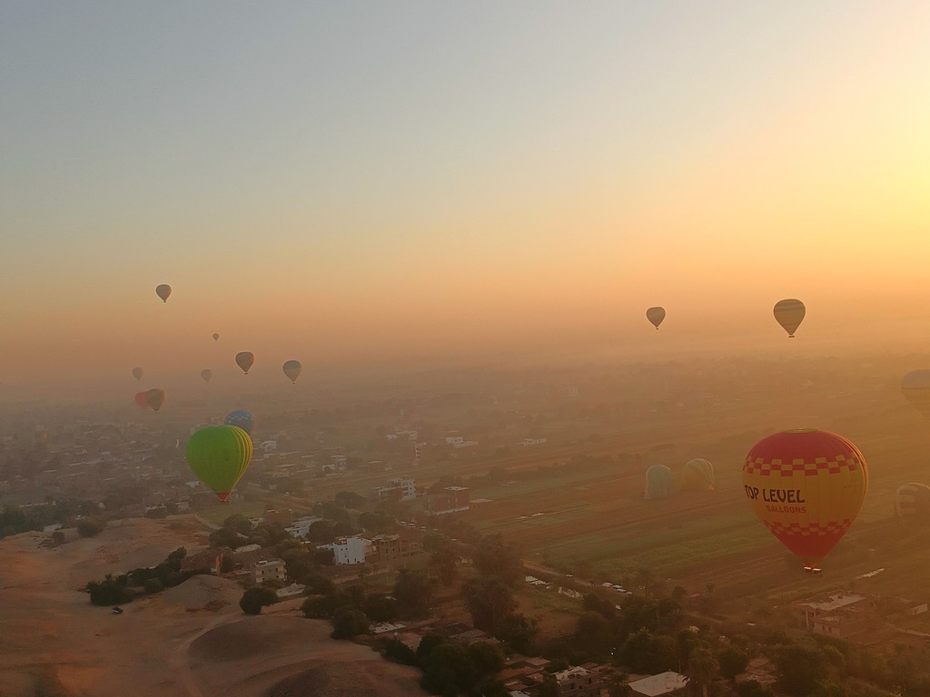 D25(11.8)~4点从宾馆出发,4:10到达尼罗河上的一艘中型船。碰到一个来自中国的小姐姐,绝对的E人,介绍自己被老板电话追踪的经历。船开了一会,到集合地点,全是丰田小面包,人满开动。路边的植物,包括夹竹桃,都是灰灰土土,脏脏的。好多人在等待,随着朝霞的出现,鼓风机开始运作,各个热气球开始膨胀,先后点火升空。马上我们就迎来了日出,大家纷纷拍起照来。飞跃帝王谷时,同伴拍照,在保护她的同时,我就静静欣赏,何其有幸,如此美景,我要更加热爱生活!6:20分,已经有热气球陆续降落了,就看见丰田小车追着自家的热气球,各自的热气球落地之后,有人铺上垫布,他们拉其中一条绳子,热气球的顶部就慢慢收缩,露出天空,空气就被吹散了吧,气球就慢慢倒下。在收的过程中,气球又复膨胀,有人就用绳子把气球的根部捆扎实。几个人抱住热气球的中段,一点点收紧再换位,把空气放掉。这个过程还挺花时间,花人力的。难怪会有一个人拿着个铝盒朝我们要小费。热气球��� 首飞圆满成功!