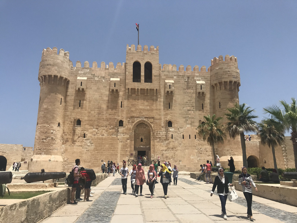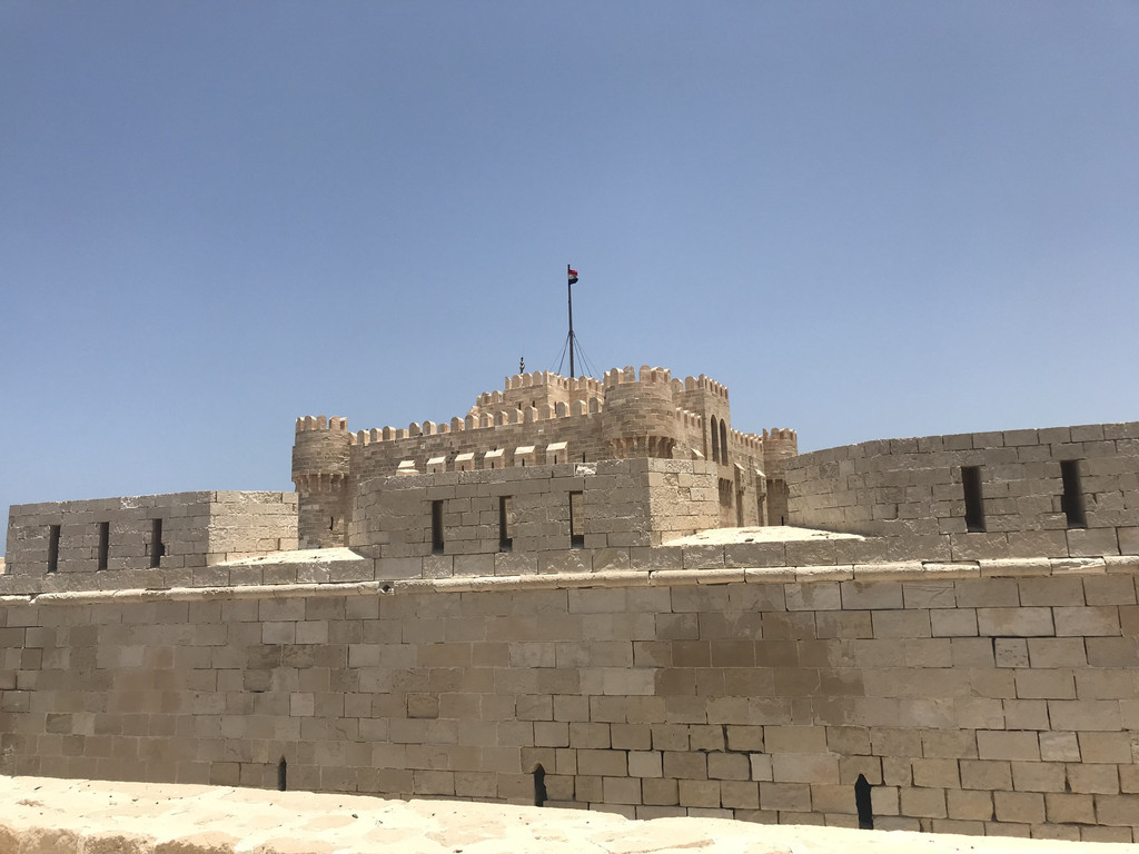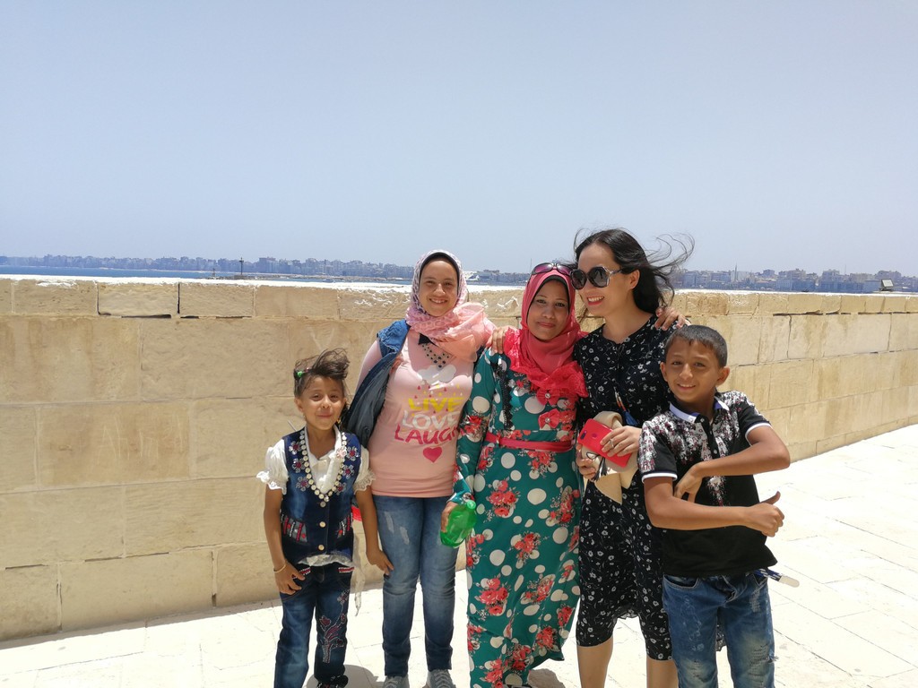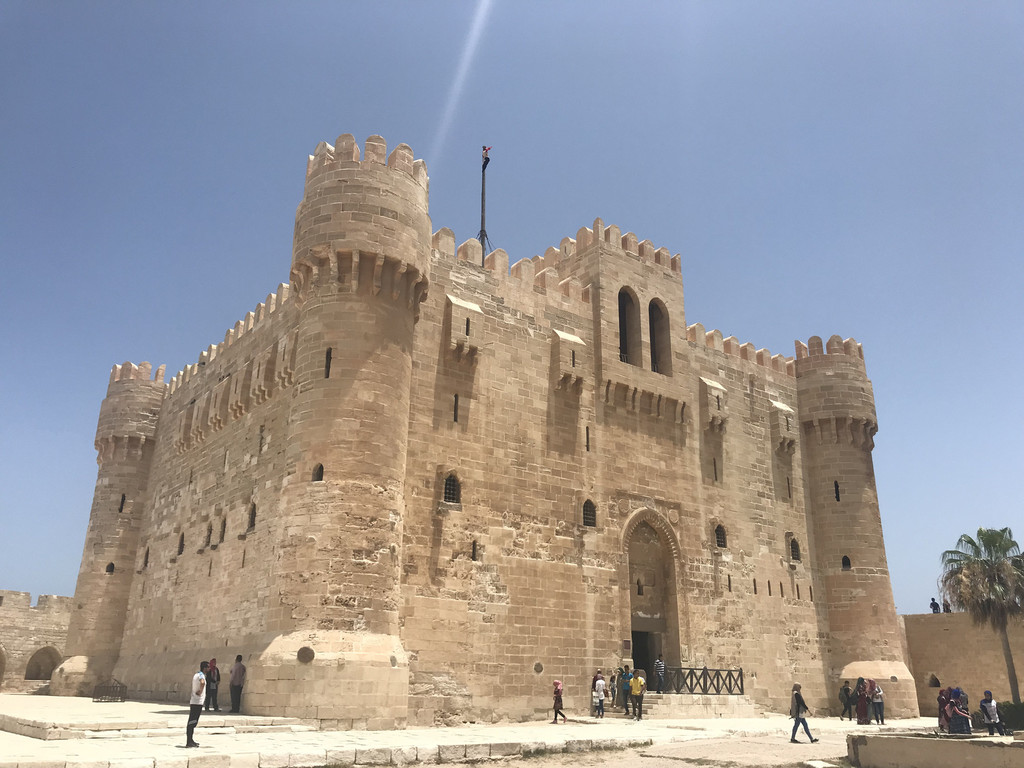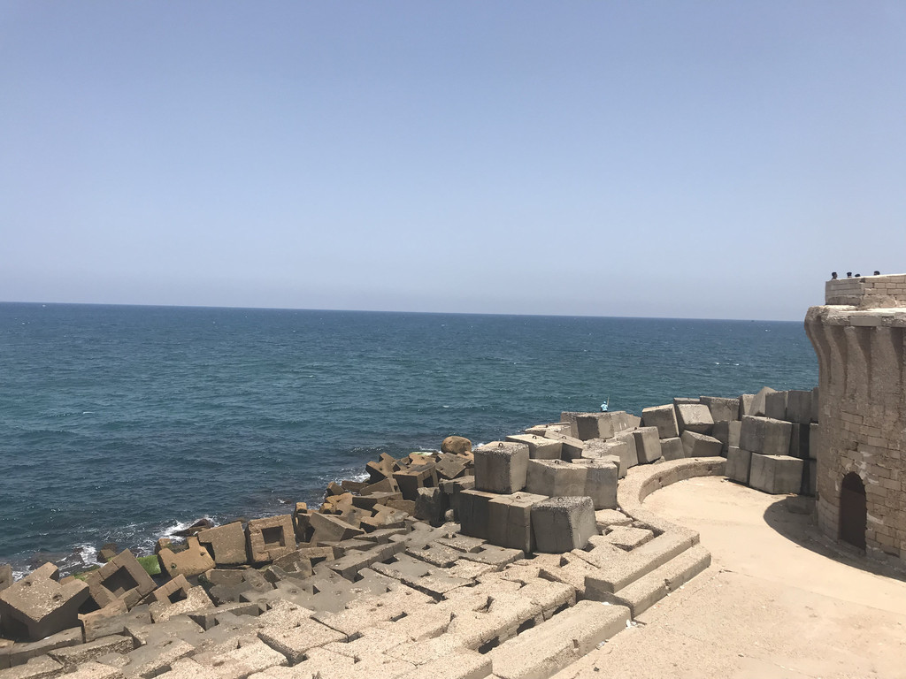 抵达亚历山大之后,司机直接就把车开到了地中海之滨,下车后的第一眼我就被地中海惊艳到,海边的礁石上长满了绿藻,翠绿、湛蓝交相辉映,煞是美丽。漫步在地中海之滨,海风习习,凉爽舒适。魁特贝古堡就矗立在地中海之滨,这里曾经是亚历山大灯塔的遗址所在地,历史上亚历山大灯塔曾被誉为世界第七大奇迹,亚历山大灯塔始建于公元前278年,塔高约135米,其塔顶的火炬从建成开始昼夜不停燃烧了近千年。后来亚历山大灯塔被毁于两次大地震,再后来被毁灯塔的石料被用于建造魁特贝古堡,魁特贝古堡其实是一座军事要塞,用来抵御来自于海上的侵略者。如今的魁特贝古堡依然宏伟壮观,是亚历山大最著名的景点之一,而当我们几张东方面孔现身古堡时,我们立刻成为了最受欢迎的一群人,引来众多的非洲人民争相与我们合影留念。