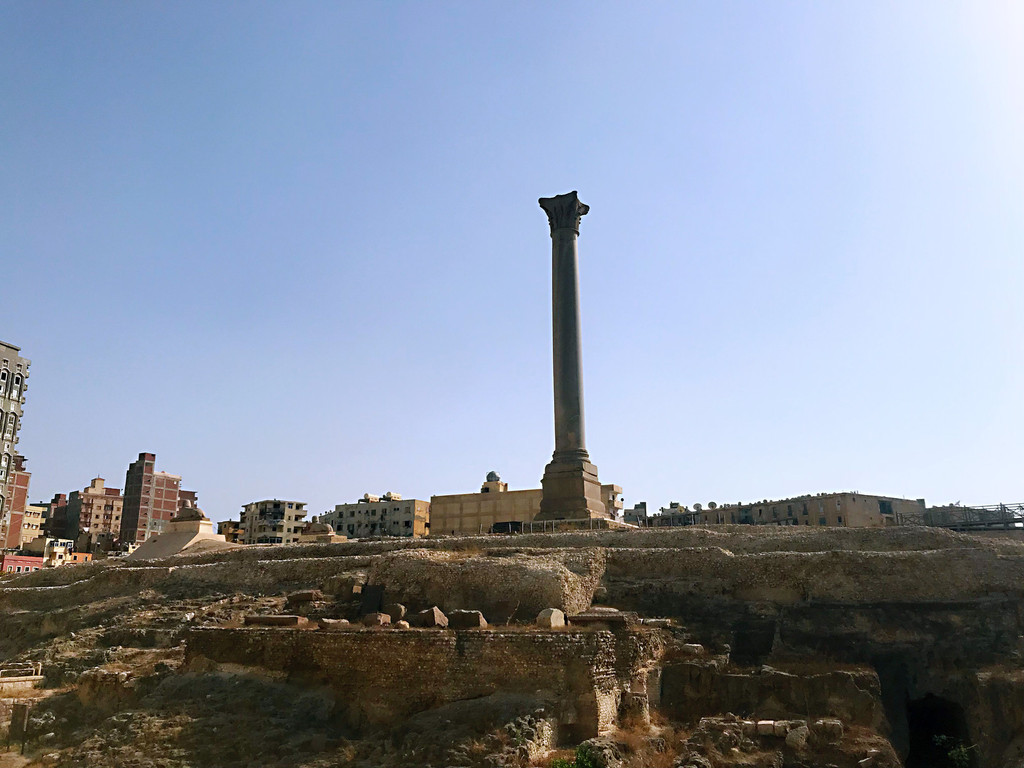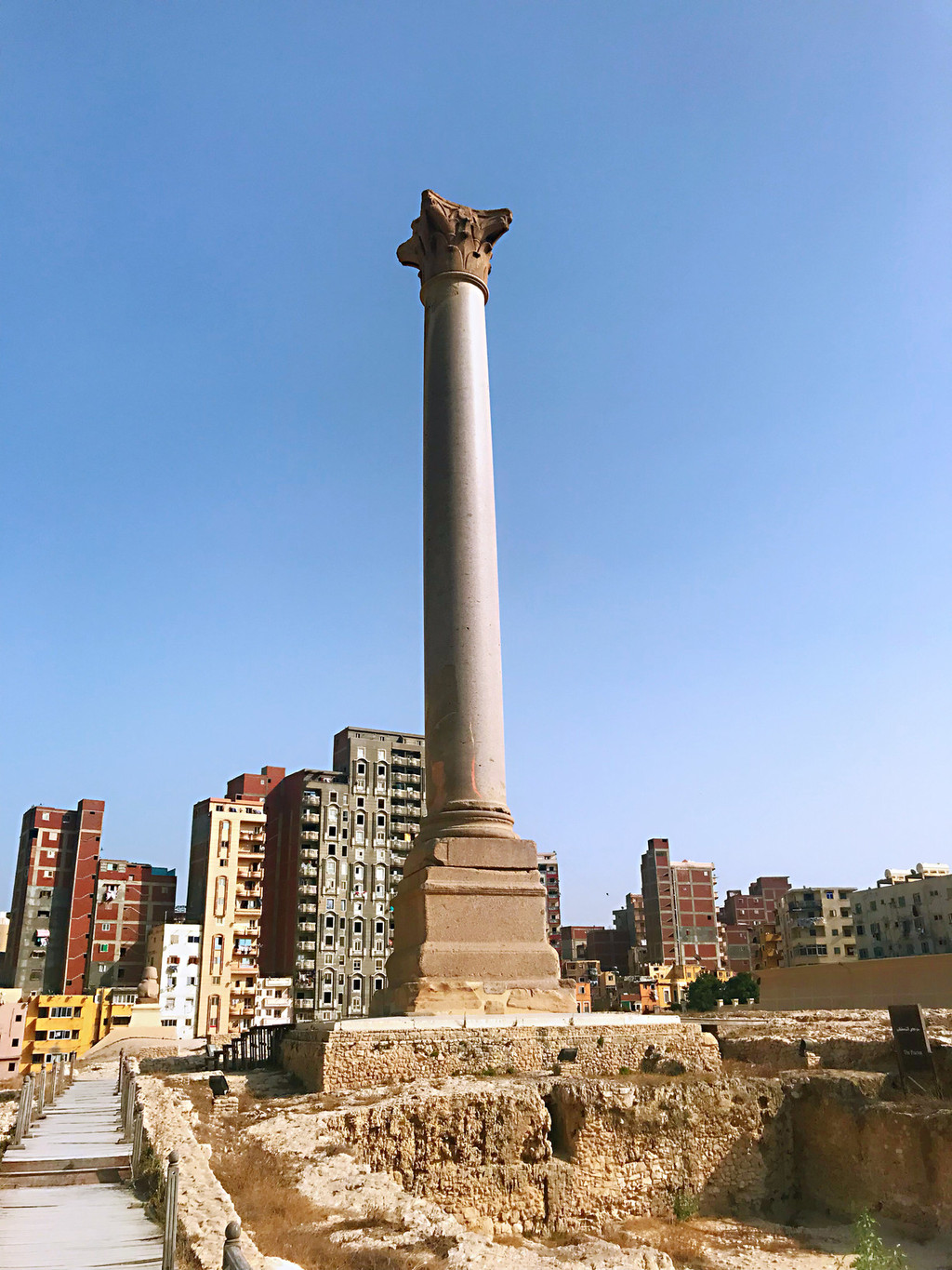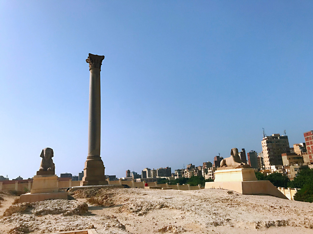 找到庞贝柱还费了点劲,老司机还问了几次路才找到,由此可见如今的庞贝柱已渐被世人所遗忘。果不其然,等我们找到庞贝柱遗址的时候,庞贝柱遗址一个游客也没有,有且只有一个庞贝柱在那儿孤独矗立。其实庞贝柱(萨瓦里石柱)曾经是埃及亚历山大城的城徽。庞贝柱又称骑士之柱,是一根粉红色亚斯文花岗岩石柱,柱顶顶着花形柱头.石柱原是萨拉皮雍神庙的一部分,萨拉皮雍神庙是希腊-埃及神萨拉皮斯最重要的神庙,最初建于托勒密三世在位时期。神庙仅仅存在很短时间就被毁了,只有石柱保存下来,成为航海者的航标。巨大的石柱已经耸立1600年。