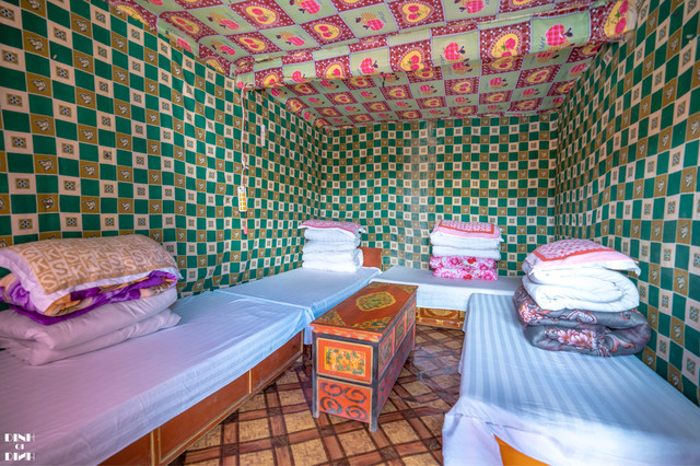 很藏式的一个房间,晚上8点断电,然后早上8点来电,大家的电器充电都得排队,也没有自来水,是送来的“桶装水”,提供暖水瓶热水,没有洗漱间,有旱厕。因为去得早,可以选房间,我们选了一间最好的床位房。