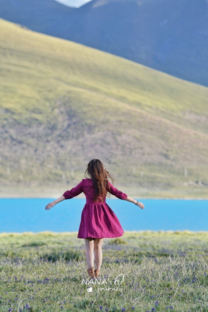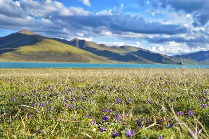 羊湖非常的大,大到是西湖的70倍,因为形状不规则,绕着羊湖的路会有很多种不一样的风景。为了更深入地欣赏羊湖,我们找了个湖边停了下来,竟然还开满了野花,让我们兴奋不已。