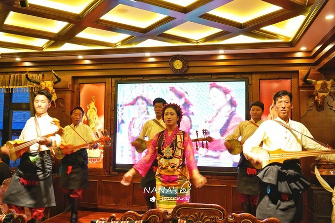 这家餐厅一看就是超热门的店儿,我们到的晚才勉强有空桌,饭菜还没上来表演就开始了。来 西藏 前蹭对藏袍研究了很久的我,再次被表演小姐姐的衣服吸引住了。