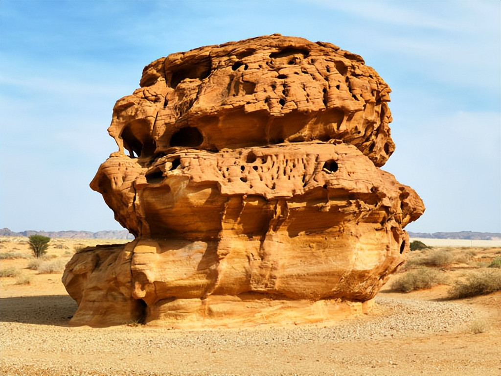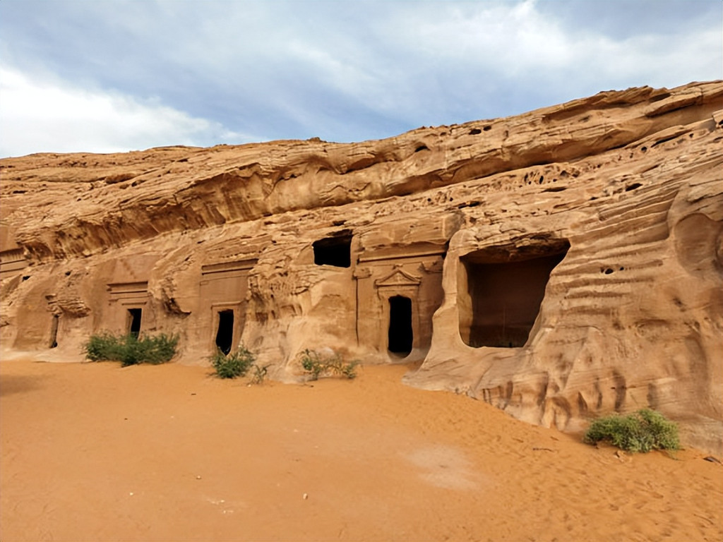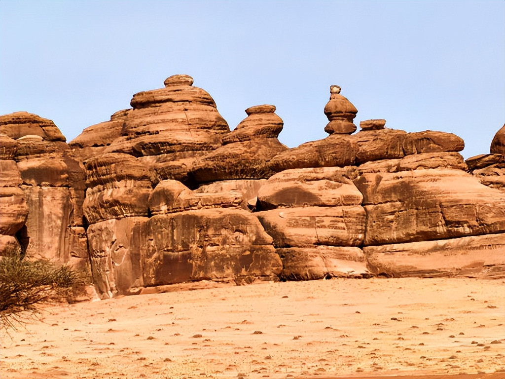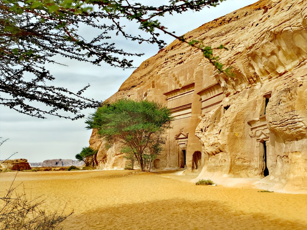 在黑格拉景区,人们视野中的这一带地貌变化多端,有壮观的峭壁深谷,有高低起伏的沙丘,夹杂着无数被风化成奇形怪状的微红色沙岩,一座座石门陵墓就分布其间,令人目不暇接。