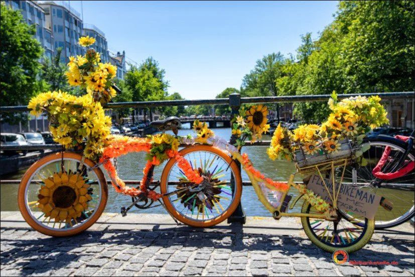 荷兰是一个自行车王国,阿姆斯特丹是一座骑在自行车上的城市。不管是风姿飒爽的少女,还是西装笔挺的上班族,还是溜娃的妈妈,都可以看到他们骑在自行车上穿梭在大街小巷。如果你恰好骑自行车而来,那么可以趁此机会请求花车人装饰您的自行车!当你看到这些欢快的花卉自行车奔跑在阿姆斯特丹街道,真是别有一番风味。