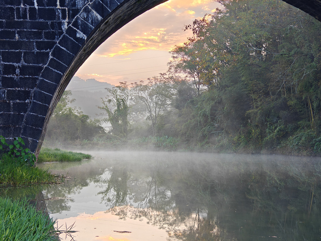 民宿附近的桥下面,水面飘起水雾,早上大概12度吧