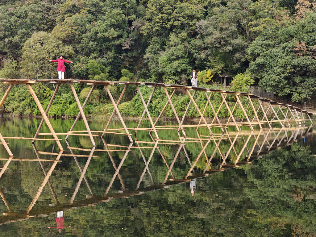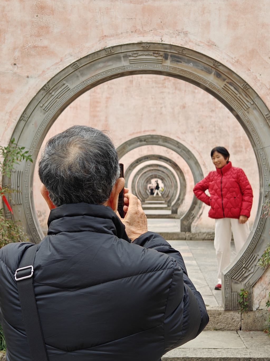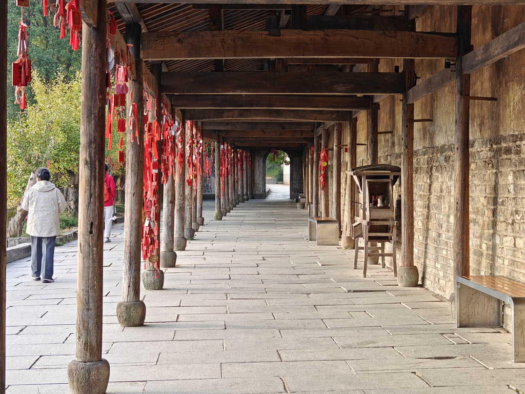 景区主入口对面有个通道,这里有个长长的门廊,旁边种满了银杏,过些日子应该是黄金大道了,这些银杏矮矮的,方便拍照,再往里走经过一个桥廊,才是八卦门