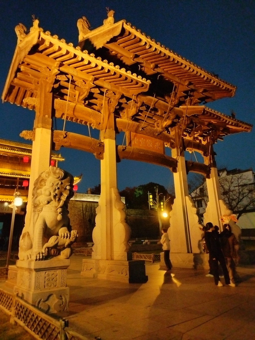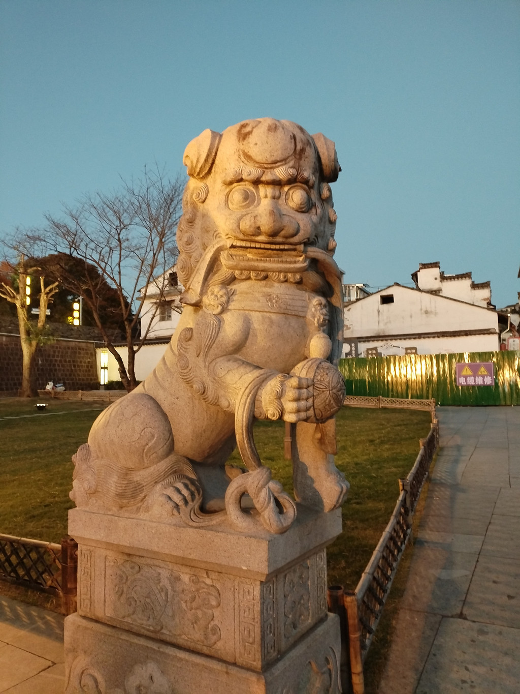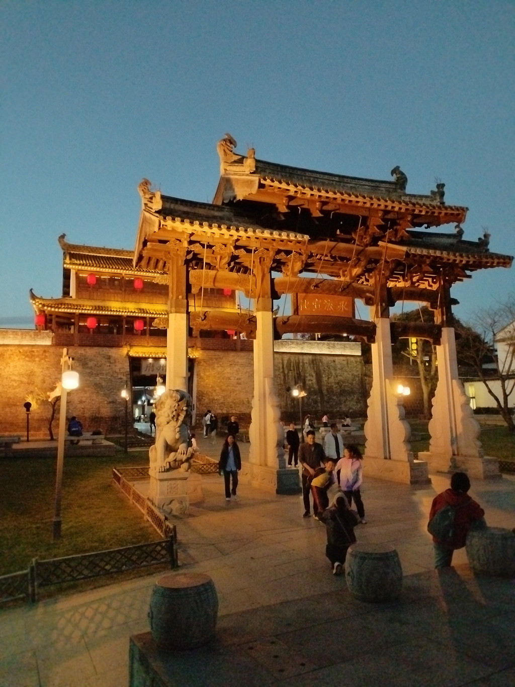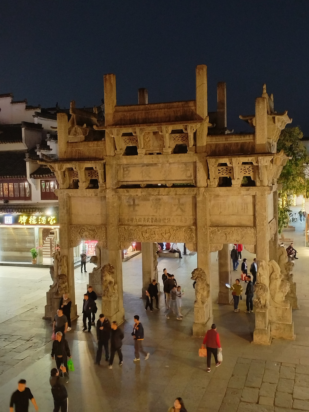 我们在古城里从夕阳西下逛到夜幕降临。古城彩灯亮起时,古老的建筑显得更加美轮美奂。最有名的建筑当属徽州府衙和许国石坊。徽州府街始建于隋义宁年间,明洪武三年复建,2009年按明弘治年规制修复。我们去的时候府衙已关门,只能在大门前逛了逛。