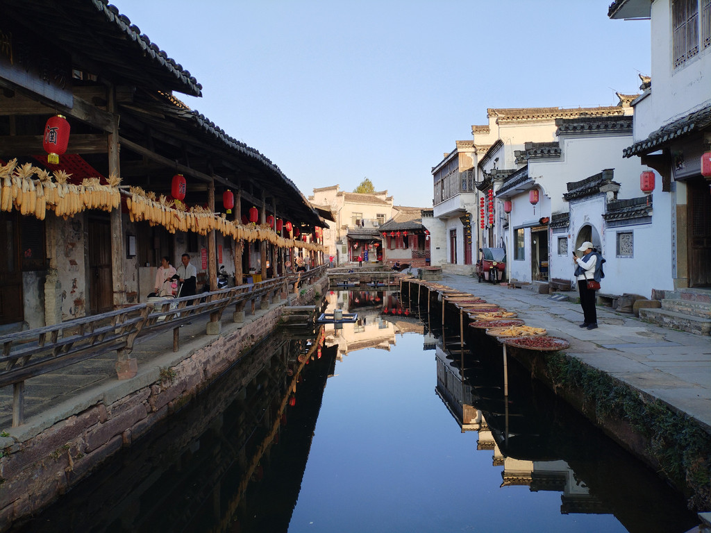 古镇中的小溪叫檀干溪,沿檀干溪两岸分布近百幢徽派民居,建有40余米避雨长廊与“美人靠”。溪上十余座古桥形态各异,构成“十桥九貌”的独特水乡风貌。这条溪像是唐模古镇的主街道,溪水很干净,溪两旁是宽阔的青石铺成的道路。这里的晒秋也很有特色,除了在广场上集中晒出各种果实外,村民们还在溪边支起竹竿,放上圆圆的竹制大簸箕,簸箕里摊放着辣椒、玉米、豆子等,溪边的避雨长廊边则悬挂着一根根金黄的玉米,它们和溪边的古宅一起倒映在檀干溪中,煞是好看。