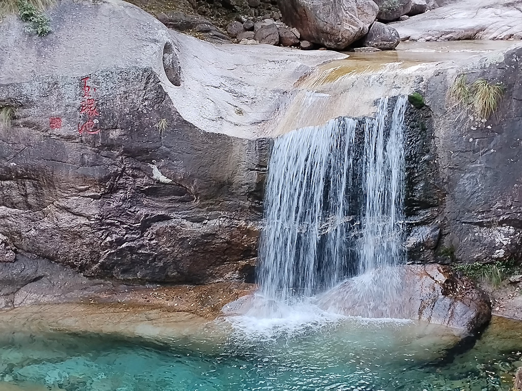 海蚌滩让人称奇,花镜池同样让人惊叹:水潭形如圆镜,潭周岩纹如彩带飘入水中;潭水碧绿,水底石头多姿多彩。难怪此潭被称为“西施池”。获奥斯卡四项大奖的《卧虎藏龙》,电影中竹梢打斗、池边爱恋、飞瀑踏波等主要镜头就是在这里拍摄的。