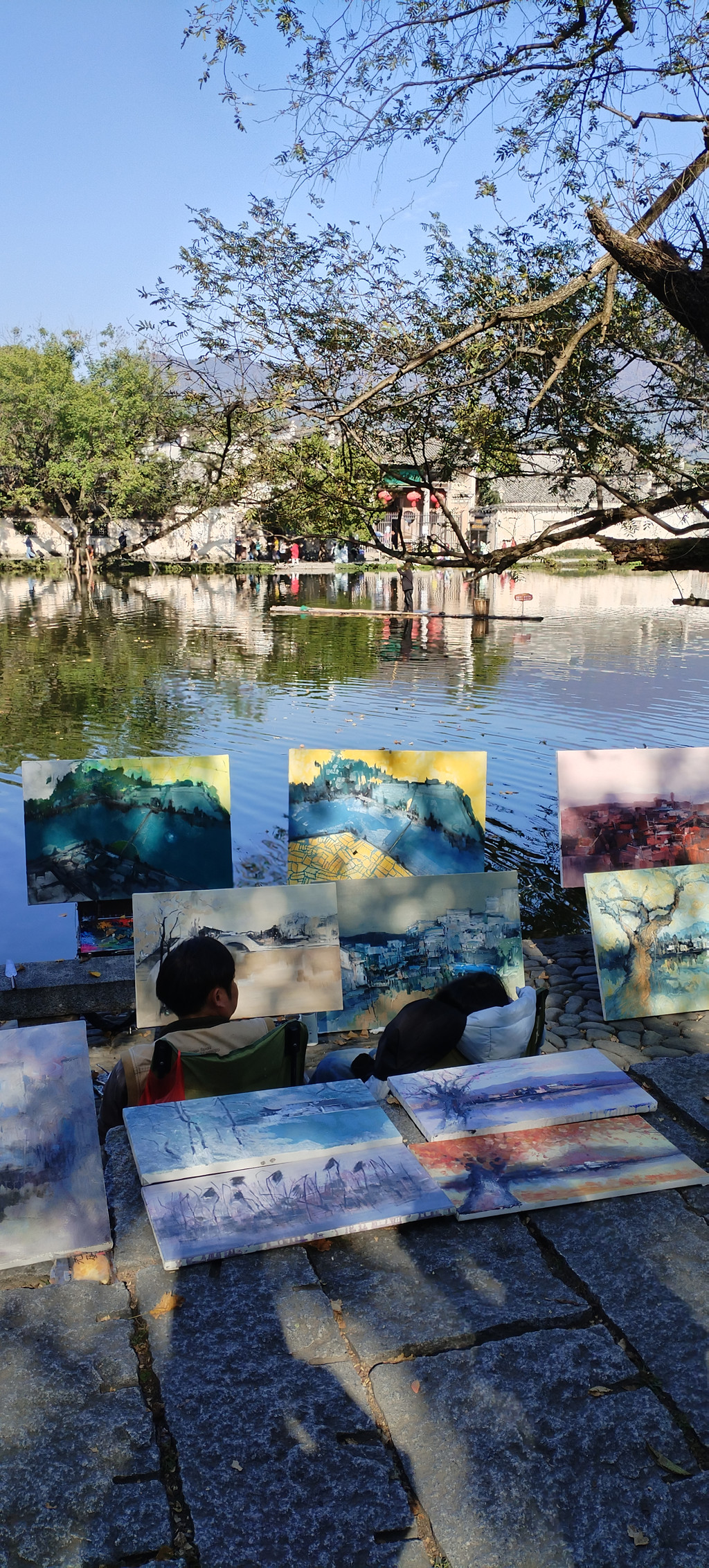 我们从南门进入宏村后,绚丽的画面少了,见到的更多是水墨画。首先迎接我们的是清澈的弓形南湖,湖上面建有一座画桥。湖的南边是各种高大的树木,树木的下面坐满了正在画画的学生。学生们画的就是南湖以及湖北边的粉墙黛瓦的徽派古民居和它们在湖中的倒影。看了景区介绍,阿李才知道,眼前美丽的南湖是宏村牛形人工水系中的牛肚。