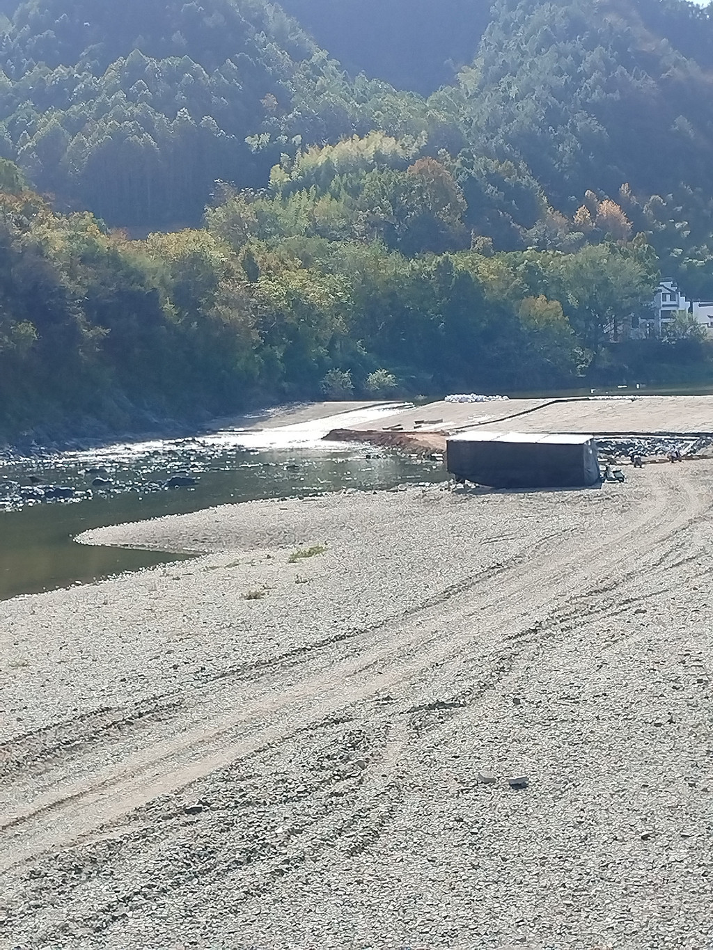 渔梁坝坝面设三道水门,正常水位仅南端低水门过水,借岸壁折冲消能,高水位时则三道水门都过水。我们参观时,只有南端的低水门有水流出。渔梁坝上面的练江较深,江面很宽,像湖泊一样,有游船在江面上游弋。江边的青山和白墙黑瓦的房子倒映在碧绿的江水中,宛如一幅山水画呈现在我们眼前。而渔梁坝下面的练江很浅,江面狭窄,江中露出很多石头,完全不能行船了。