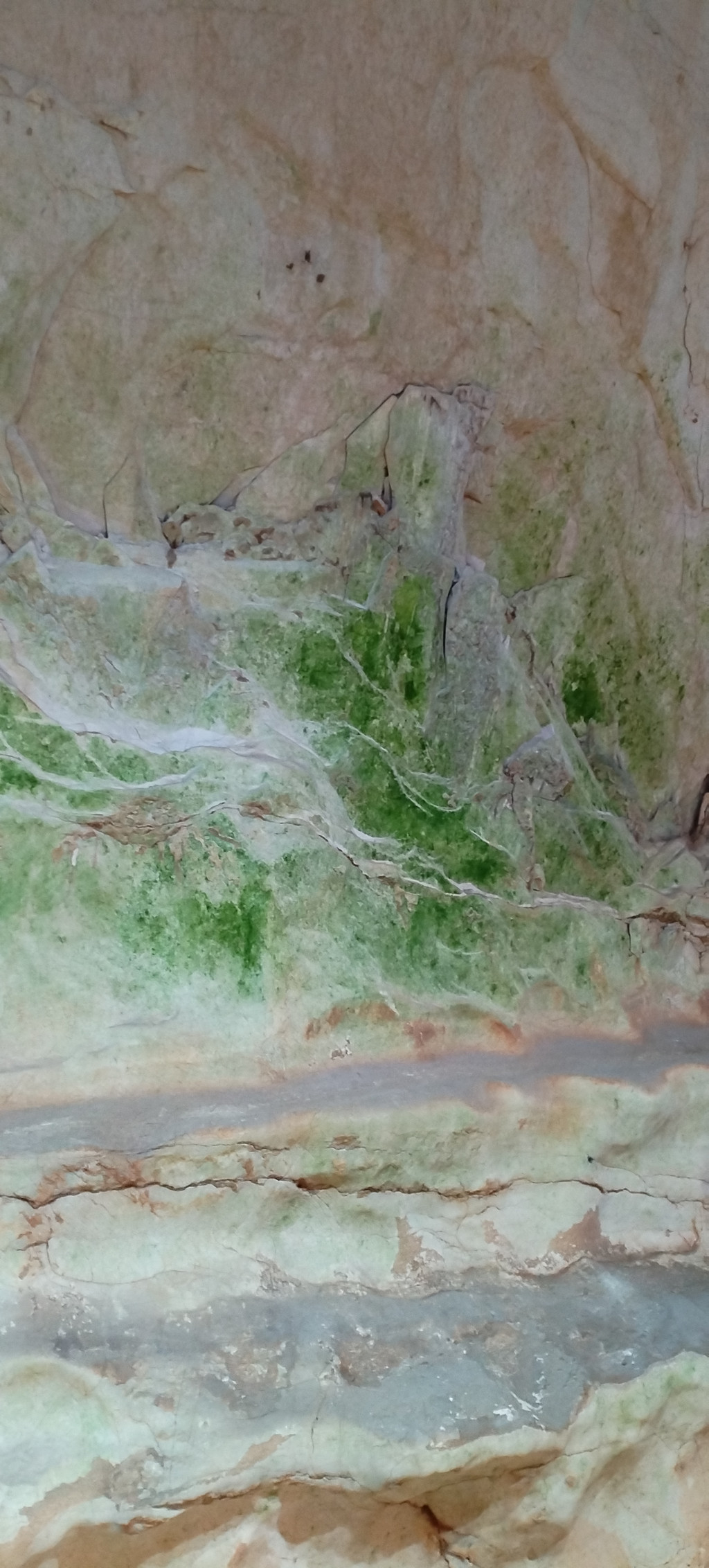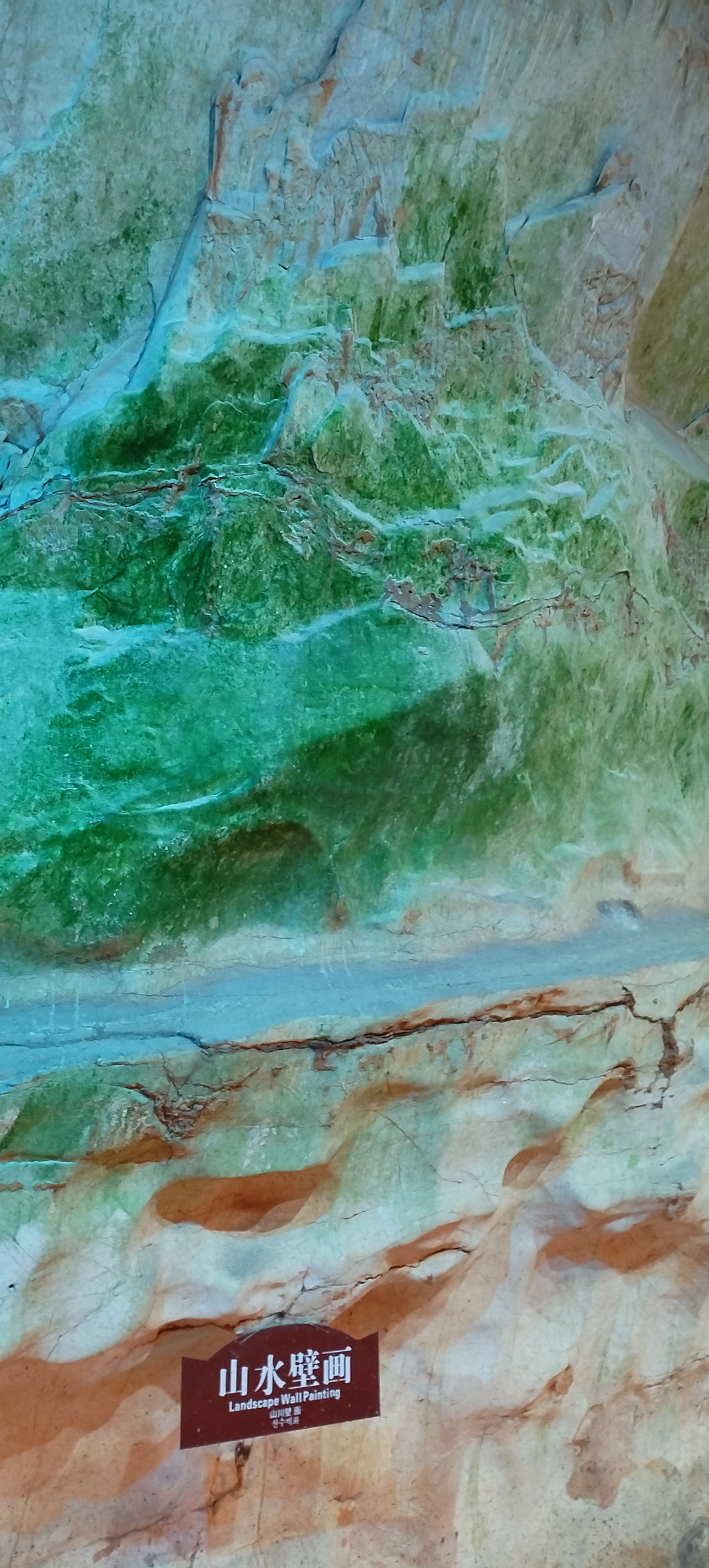 山水壁画有些神奇:在一面很长的石壁上,有一幅高约三米、长约十三米的立体山水画,颜色以绿色为主。仔细观看,可以看出画面里似乎有亭台楼阁、险峻山峰、峡谷河流,这些景观好像是人工雕刻的。其实这幅山水画是石灰岩石壁在地下水长期溶蚀作用下的杰作,实属天工巧成!阿李参观过很多溶洞,像这样天成的山水壁画,却是第一次见到,难怪它会成为“蓬莱四绝”之一。