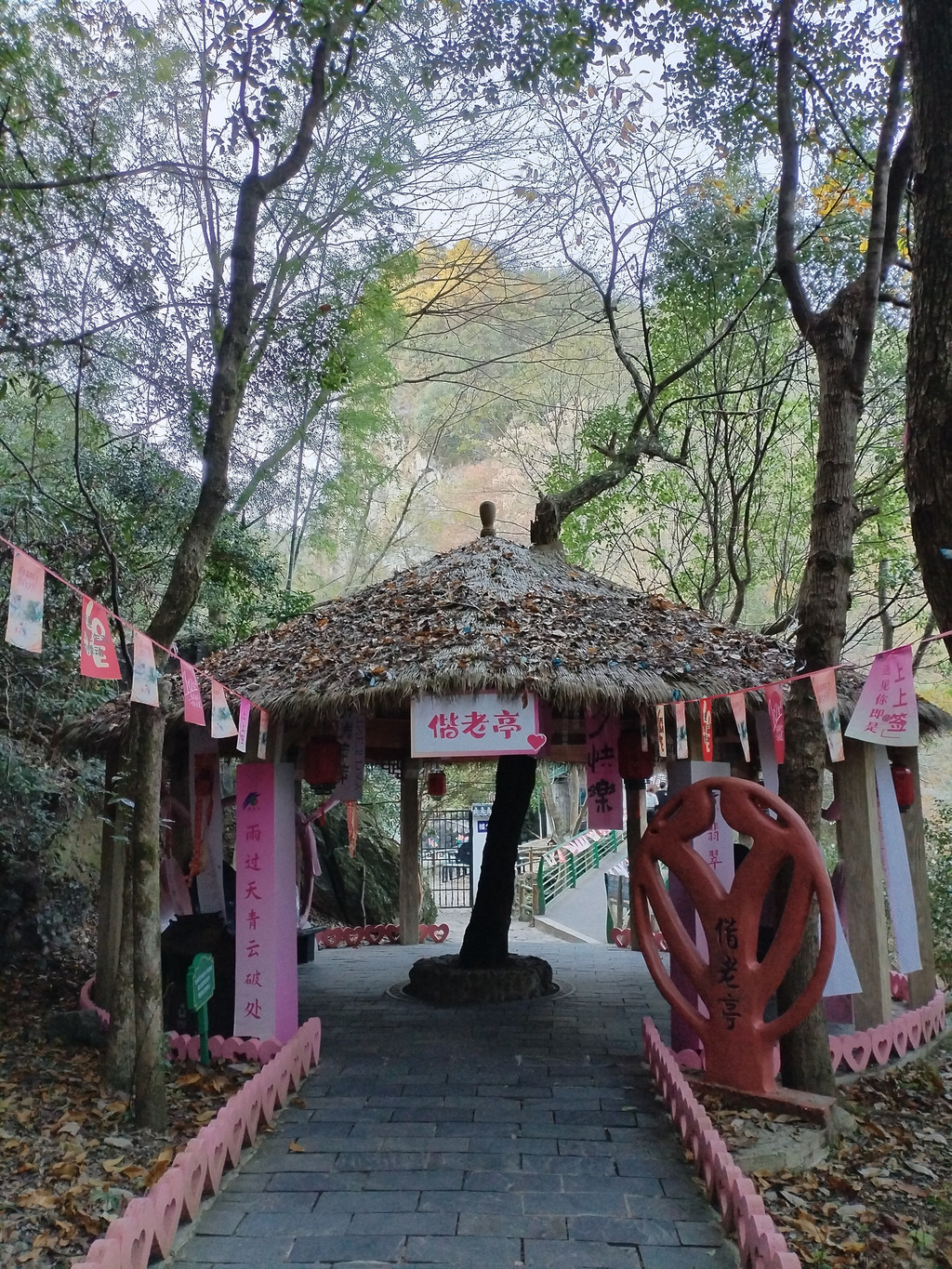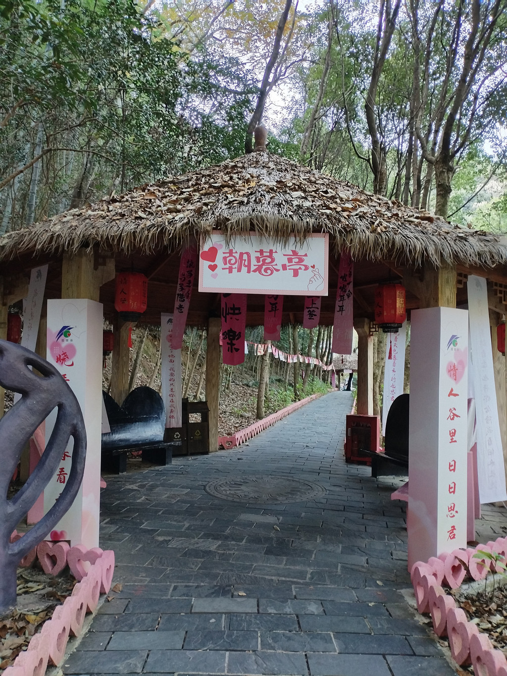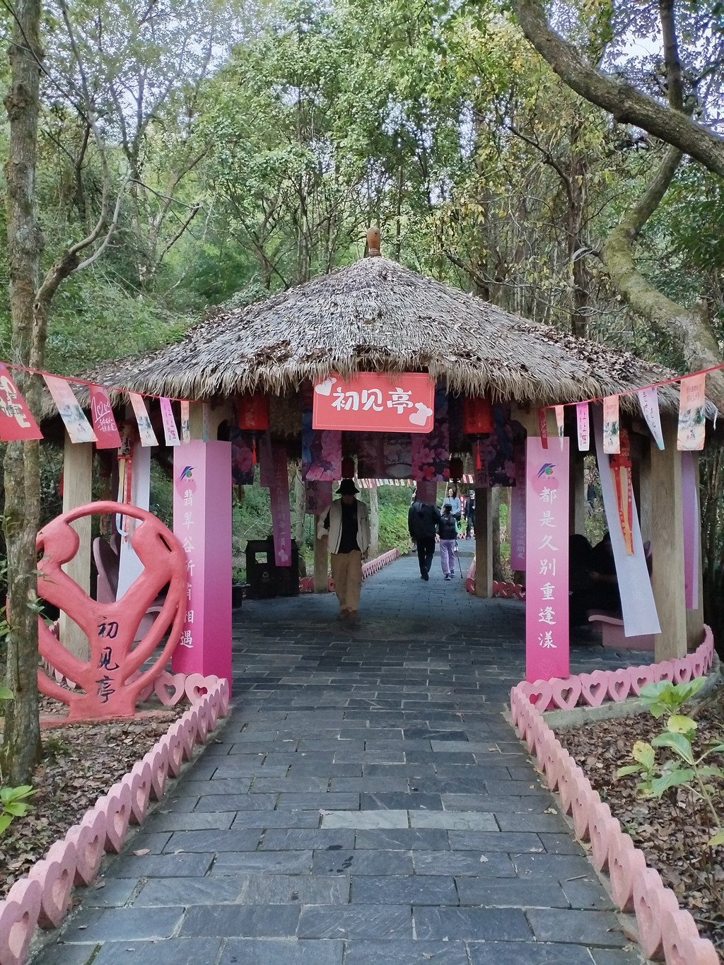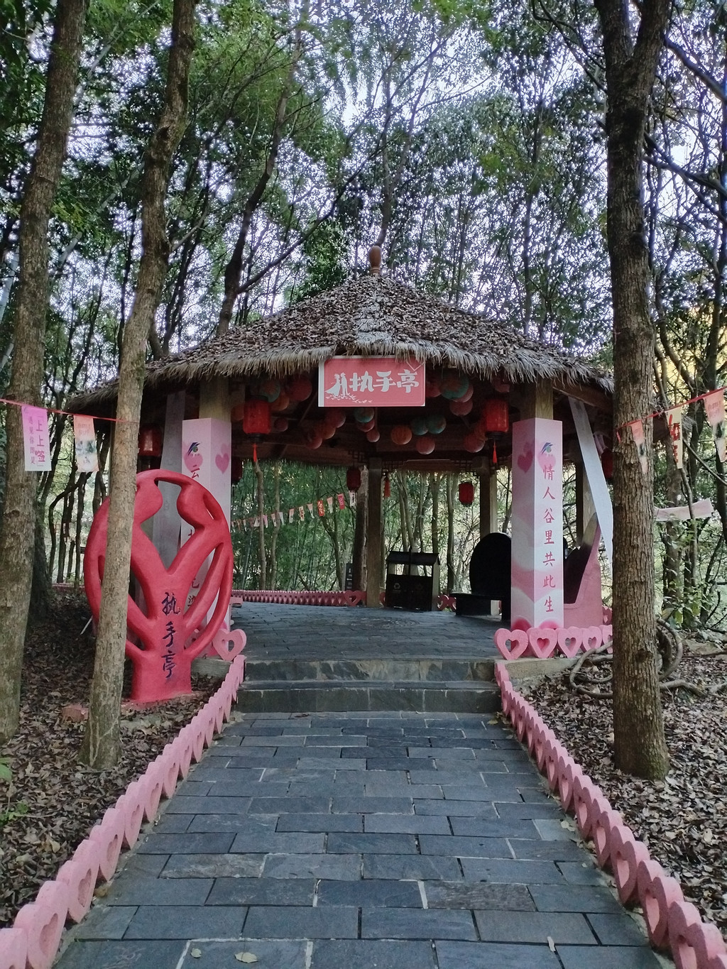 进入峡谷前,我们经过了一段长长的“情侣道”。步道两旁是高大的树木,路边栏杆是用无数个粉红色爱心围成的。步道隔一段距离就建有一个亭子,亭子顶部用茅草覆盖,亭子门楣上写着不同的亭子名,门两旁挂着内容与爱情有关的对联,亭子里放着心形的椅子。我们依次走过了“初见亭”、“灵犀亭”、“执手亭”、“朝暮亭”、“偕老亭”五个亭子,似乎走过了一个人的一辈子——情人谷的第一个景点“情侣道”,有些让人思绪万千哦!