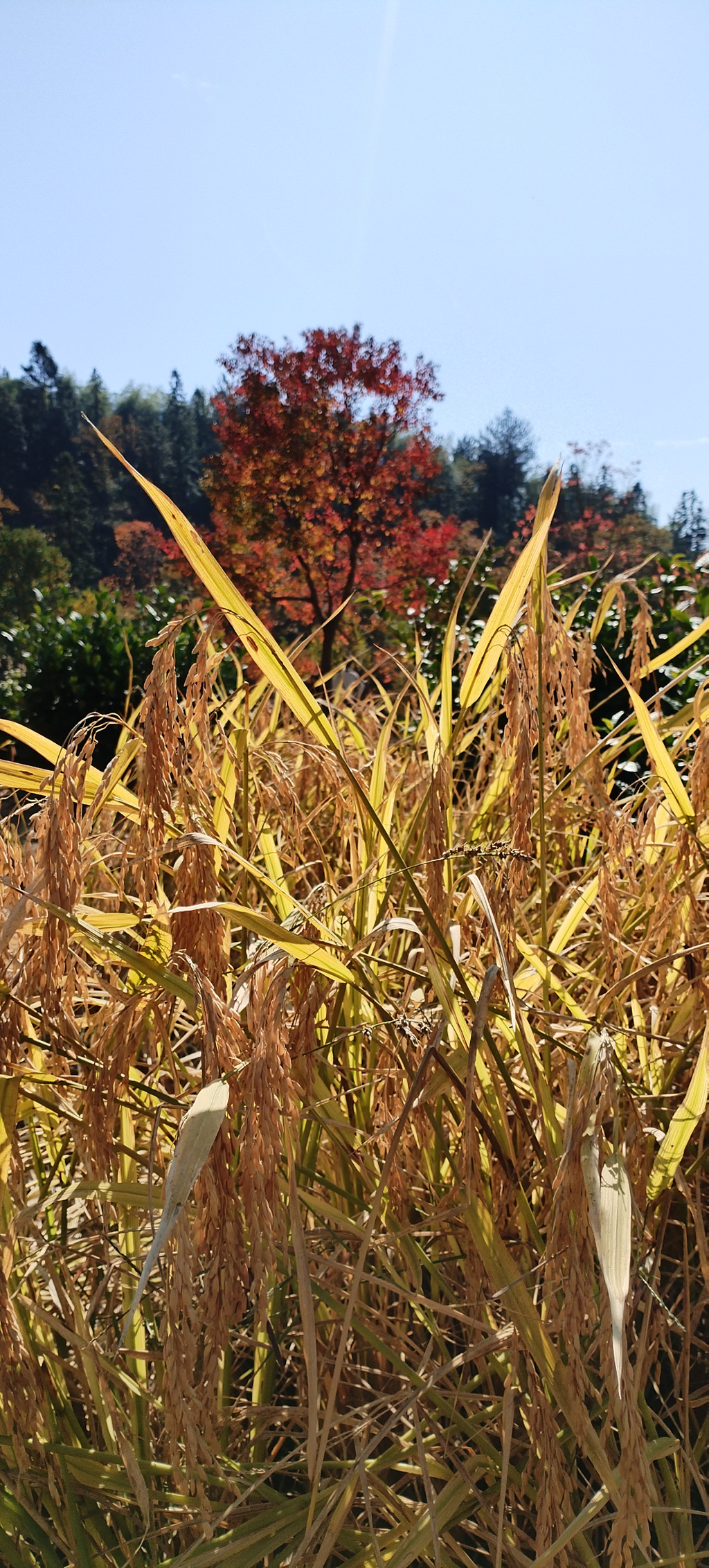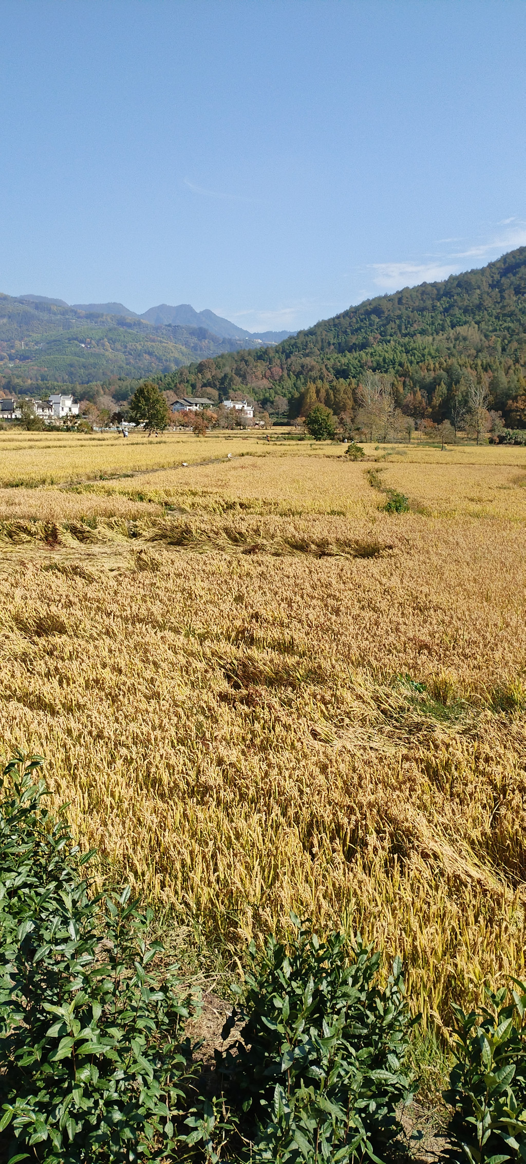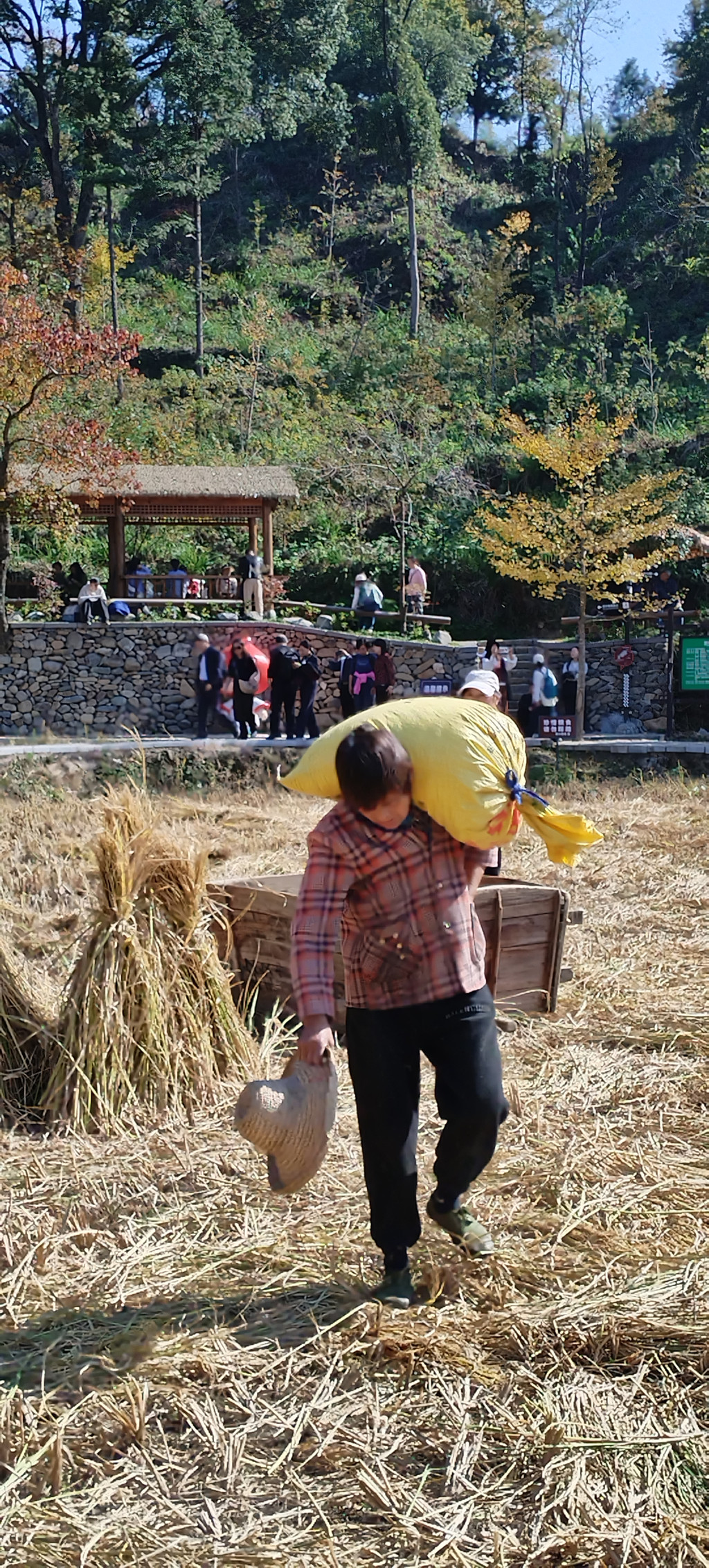 村子旁边有梯田,种着水稻。稻田四周,也栽了很多乌桕树和枫香木。此时大部分稻田已收割,田里只剩下金黄的稻草,一些孩子就拿着这些稻草扔着玩。只有小部分稻田没有收割,沉甸甸的稻穗在阳光下闪耀着金色光芒。