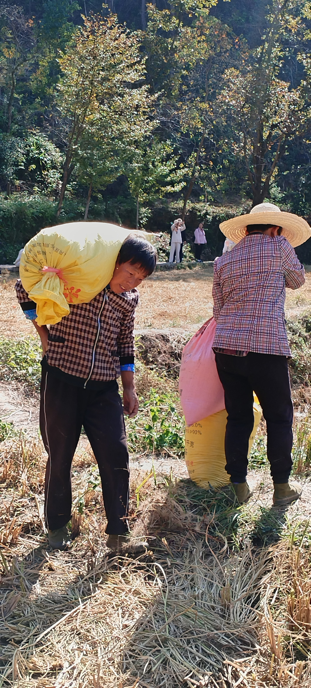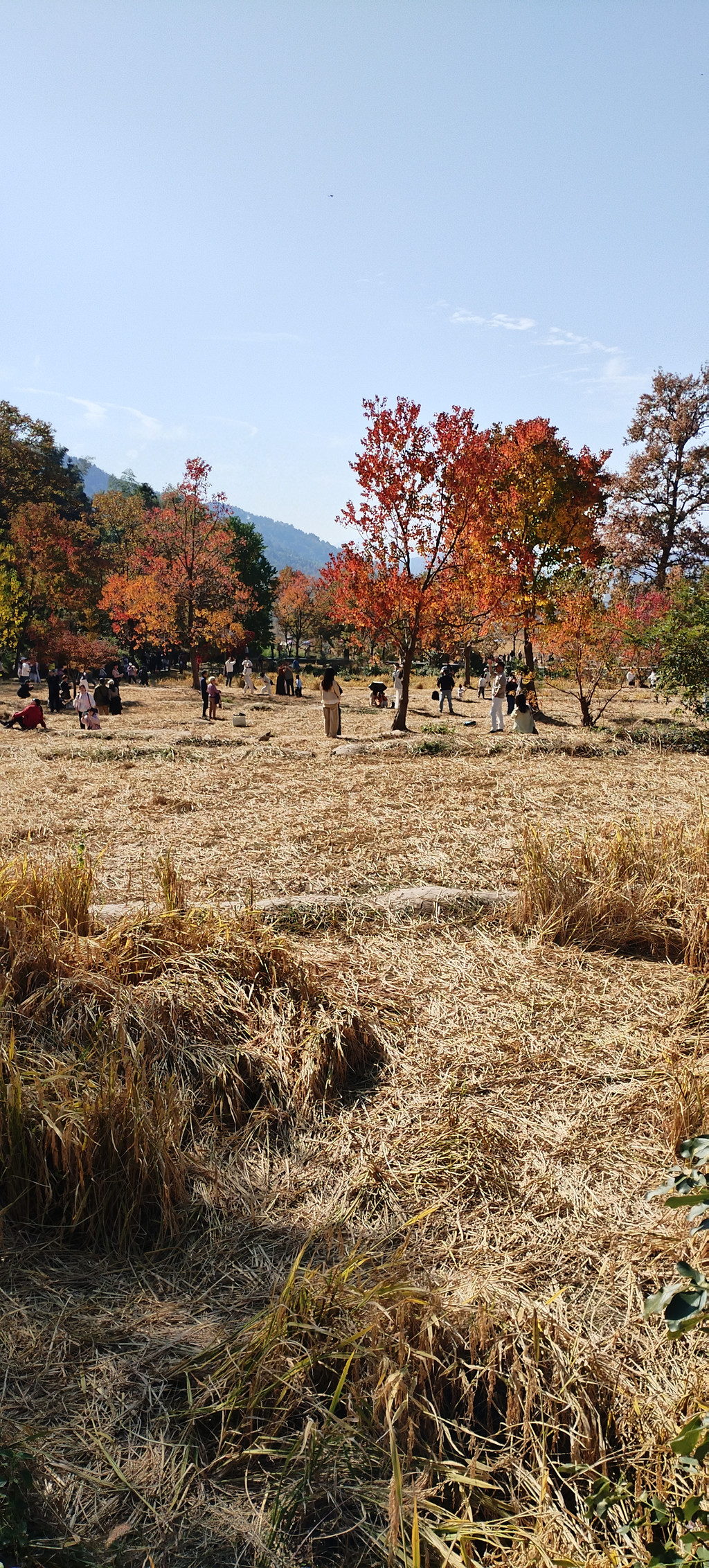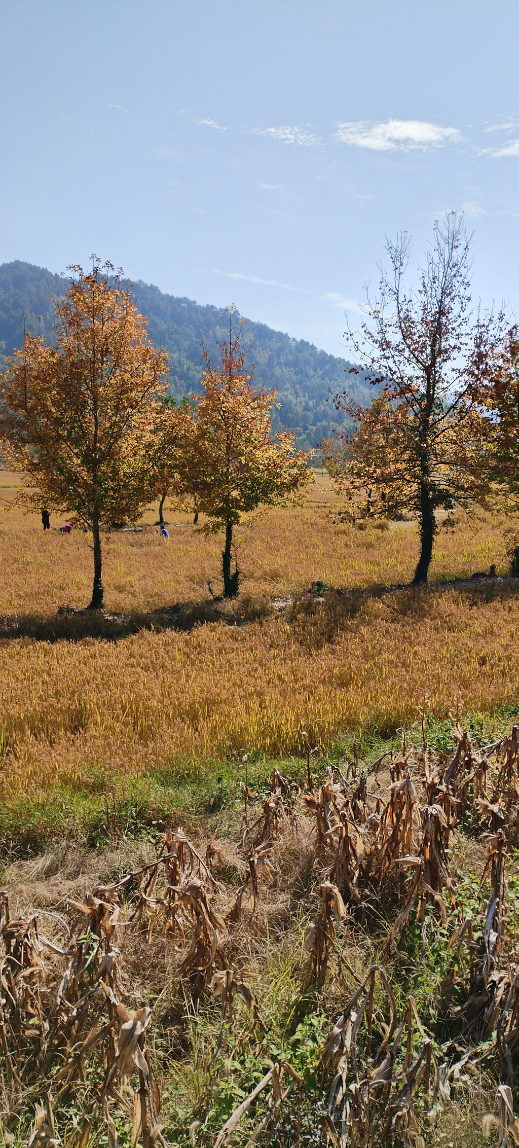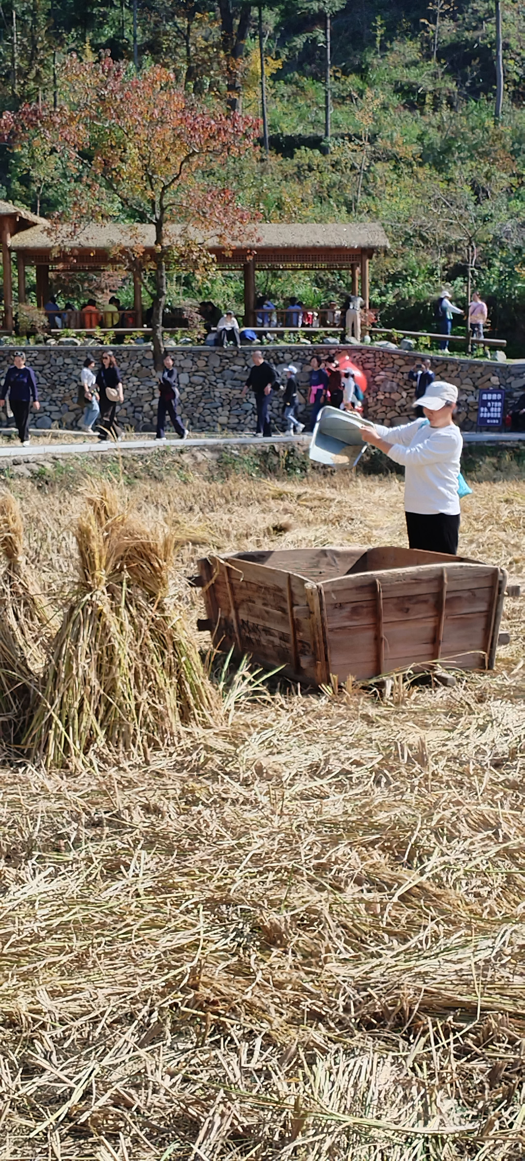 村子旁边有梯田,种着水稻。稻田四周,也栽了很多乌桕树和枫香木。此时大部分稻田已收割,田里只剩下金黄的稻草,一些孩子就拿着这些稻草扔着玩。只有小部分稻田没有收割,沉甸甸的稻穗在阳光下闪耀着金色光芒。
