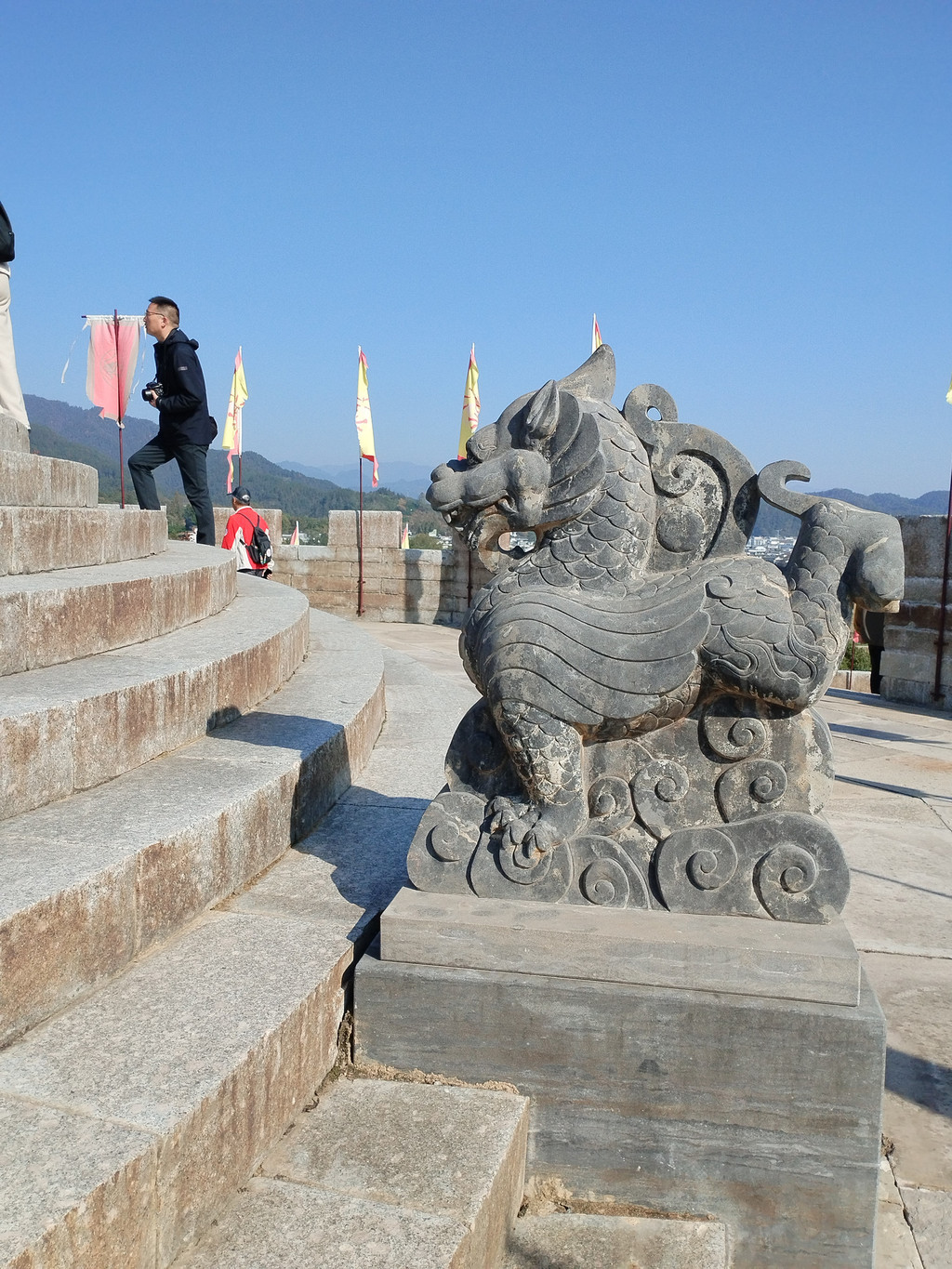 在天地坛上眺望了整个村庄风景后,阿李走下坛来,和友友继续参观。在清清的永兴湖边,有一个平安坎,跨过这个坎,就进入了呈坎村民的居住区。这个平安坎是一块横卧在大路上的长方形青石,它两边各有一头石狮。听导游说,女人过这个坎时要迈右脚,同时用右手摸右边石狮的头;男人过这个坎时,要迈左脚,用左手摸左边的石狮的头;这样过去后,每个人就平平安安,一生无坎了!于是,平安坎前,排起了长队,大家都严格按照要求迈过这道坎,力争自己从此一生无坎!